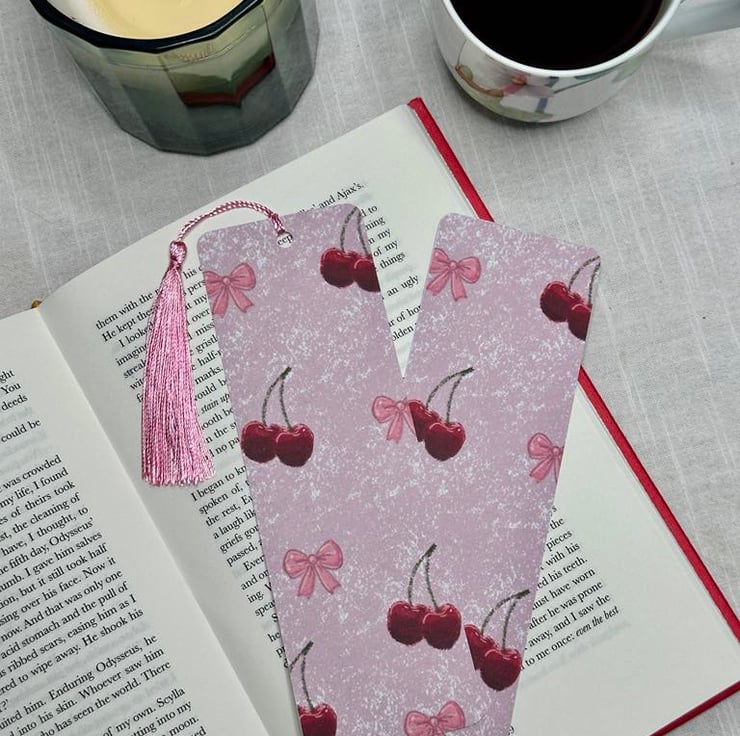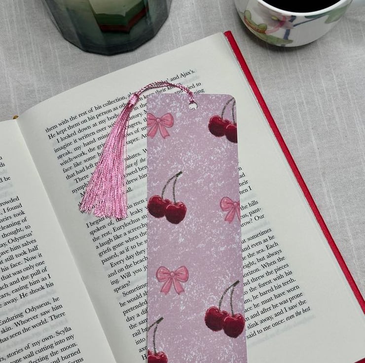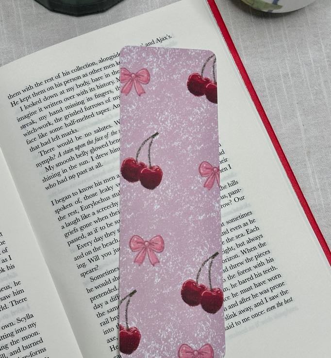 Brighten up your reading moments with this delightful cherry-themed bookmark! Hand-drawn cherries and bows stand out against a soft, textured pink background, bringing a cozy and nostalgic charm to your pages. Made with high-quality materials, this bookmark is both durable and stylish – a perfect little treat for book lovers or anyone who loves a touch of sweetness in their day.