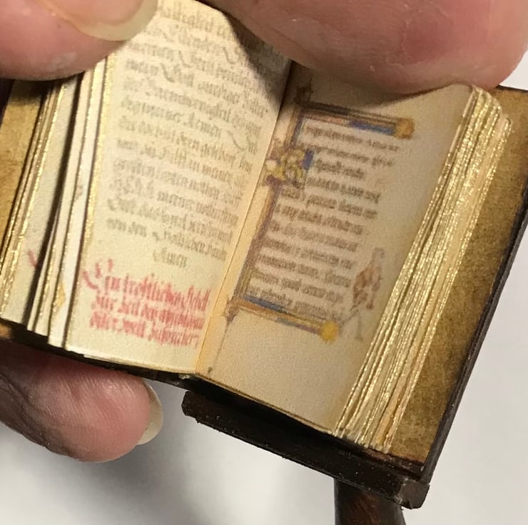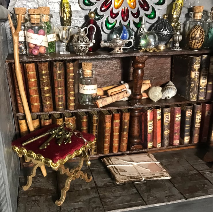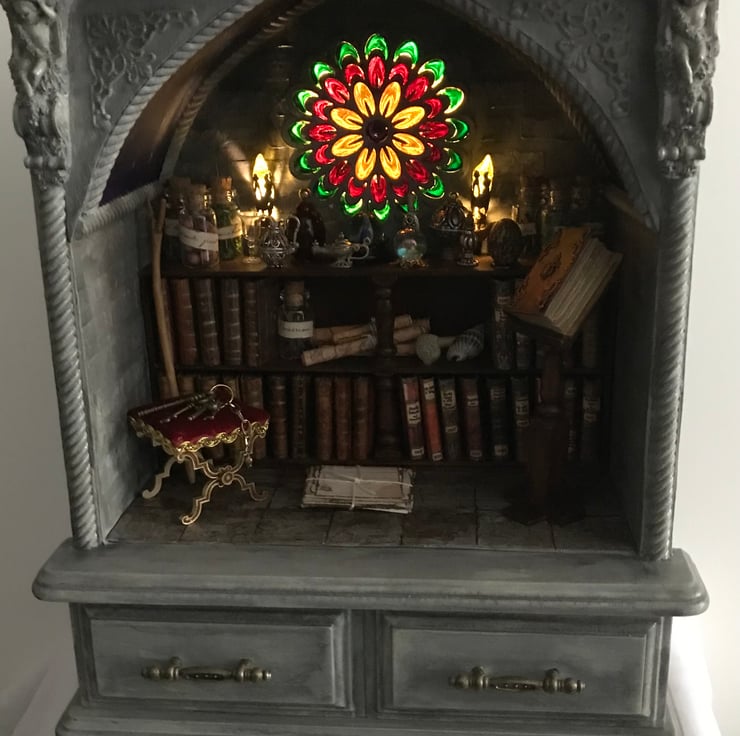 The Alchemists Chamber - step back a thousand years to the time of the alchemist. The Alchemist has just left his chamber which situated in a secluded part of his castle and filled with all the paraphernalia of his dark art. On his book shelves he has 30 fully functioning books full of the knowledge of murder, poisons and alchemy. His most important book is on the lectern. His pet raven sits on a pile of documents and the keys to the castle are on his curule stool. His wonderful stained glass rose window glows when the torches in their wall sconces are lit. 1:12th scale. Measurements are 12”H x 9”W x 5 1/2”D. Lit by LED’s, battery pack in drawer. All handmade.