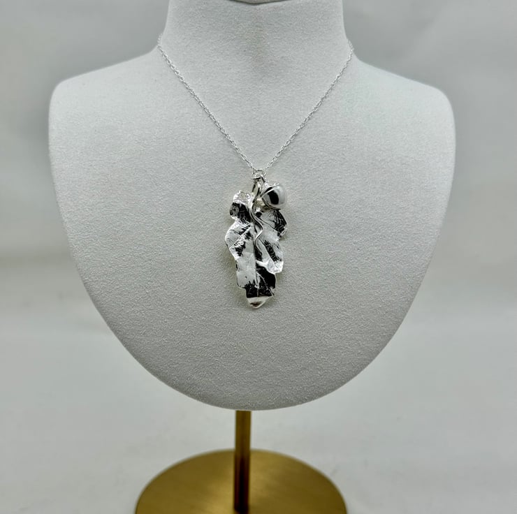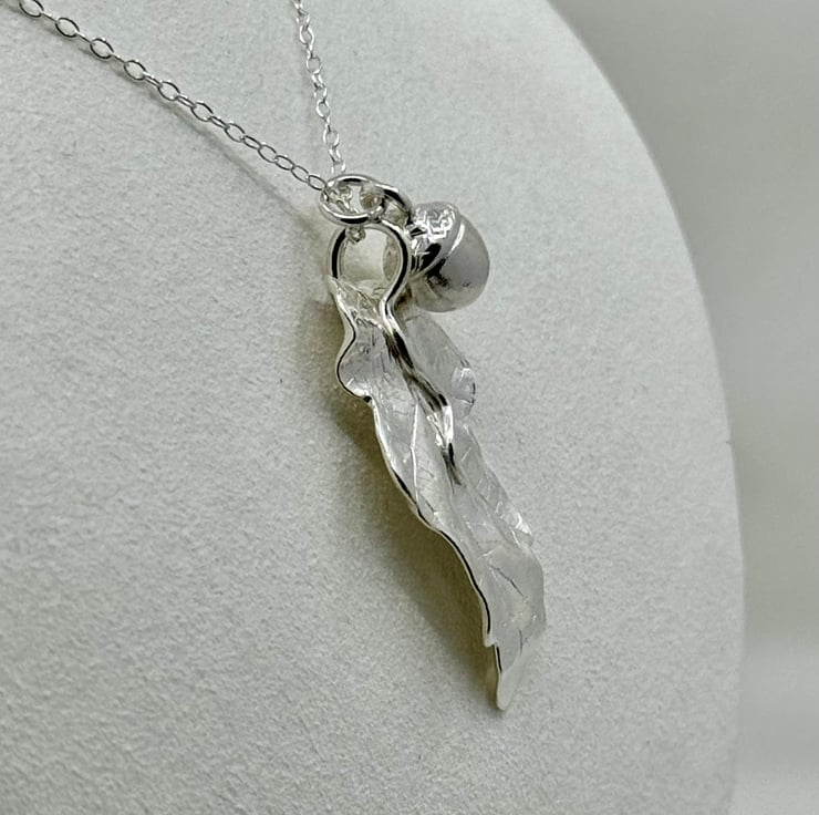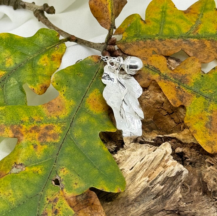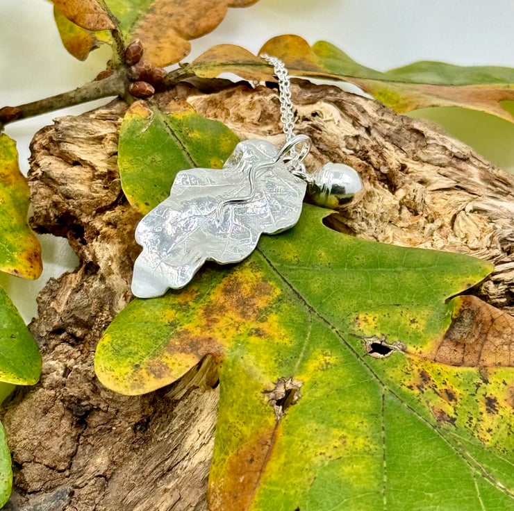 One of a kind stunning Fine Silver Oak Leaf & Acorn Necklace. I have handmade this necklace using eco-friendly silver metal clay and an oak leaf and acorn from a walk in the local Yorkshire countryside. I apply metal clay paste onto the back of the leaf and create a mould of the acorn which I then cast with lump clay - both are kiln fired resulting in solid 999 fine silver. The surface texture of the leaf and acorn are individual to the surface textures of the leaf and acorn I used in the creation of these pieces, therefore this is bespoke necklace design.
