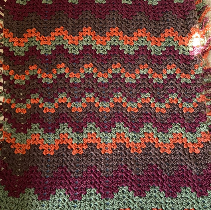 The design is a granny stitch, in a zig zag pattern inspired by falling leaves. The long edges of the blanket have tassel fringing.