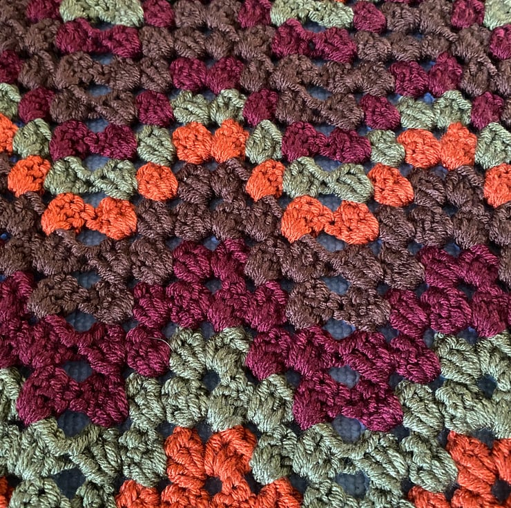 The blanket measures approximately 110cm x 80cm, and is crafted in Scheepjes Chunky Monkey premium 100% acrylic yarn in colours tawny, moss green, maroon and rust.