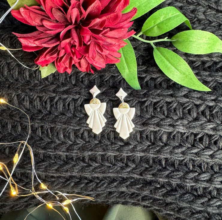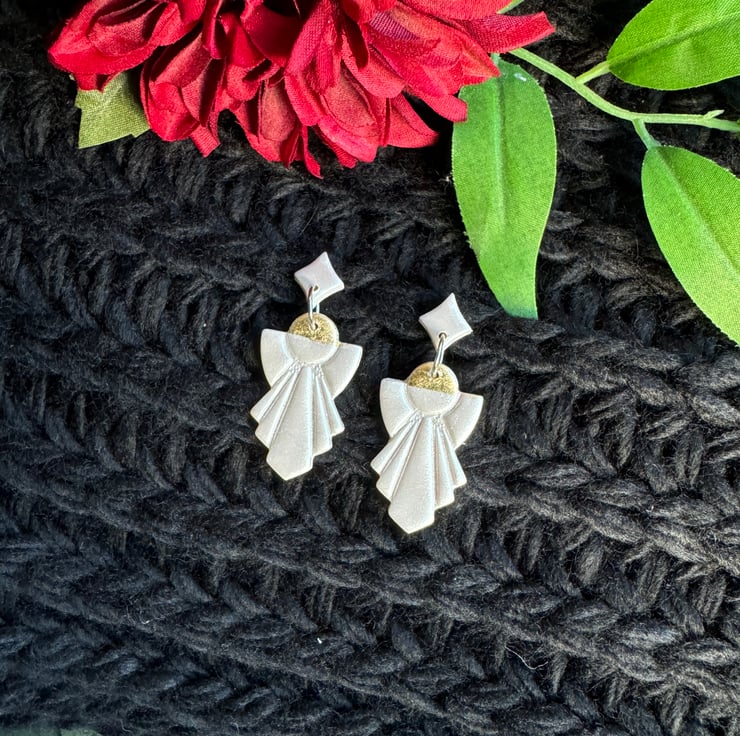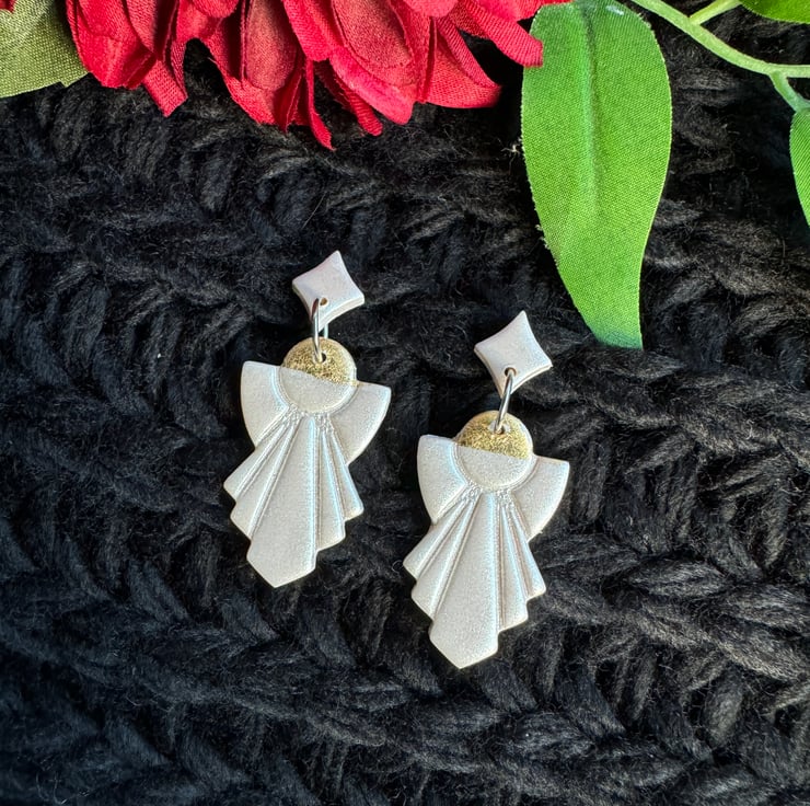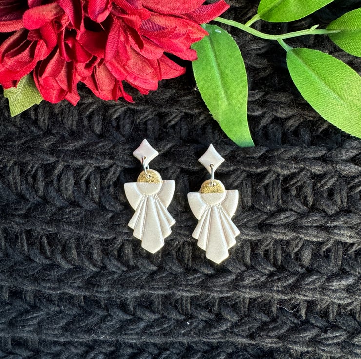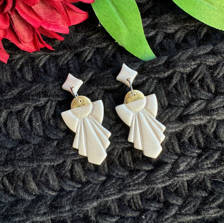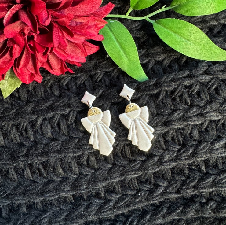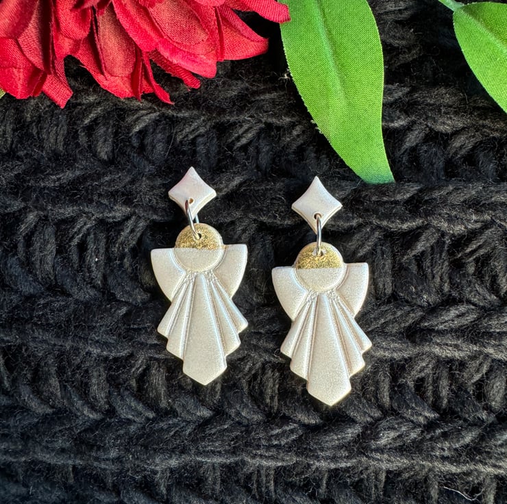 Conceptual Angel earrings with an art deco flare from shape to embossed lines. With a dainty diamond star, halo like accompanying shape.