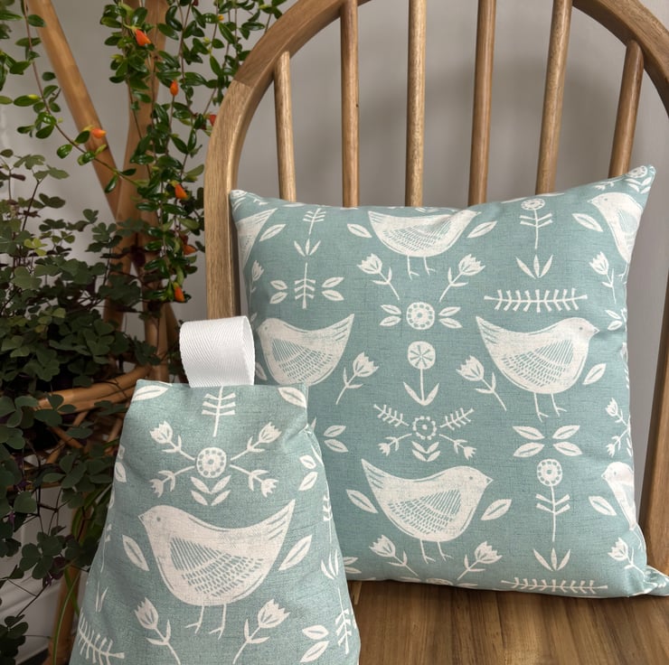 Handmade cotton fabric doorstop in seafoam with a Scandi inspired white bird and flower print.
