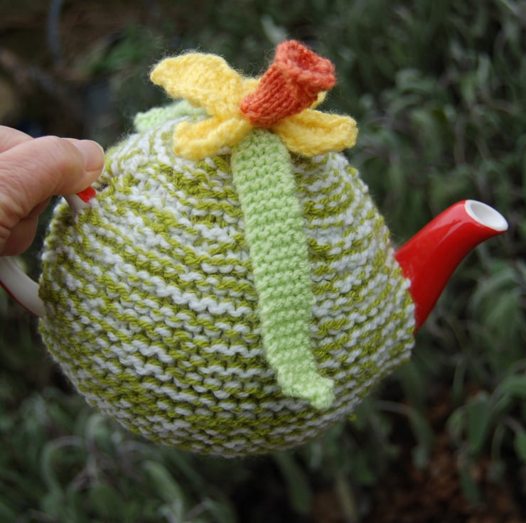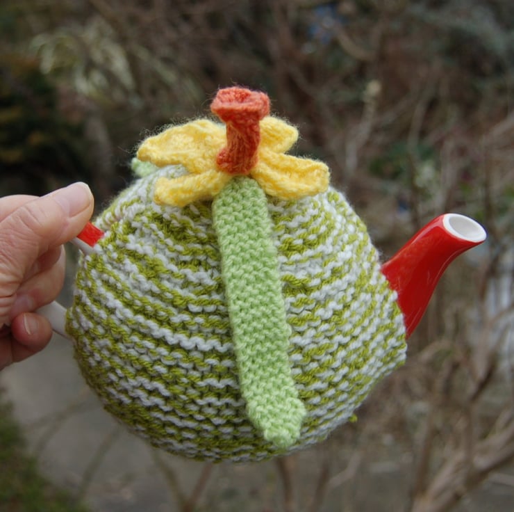 A lovely tea cosy knitted using two strands of acrylic yarn in cream and green. Topped with a knitted daffodil flower with yellow petals and an orange trumpet in acrylic yarn.