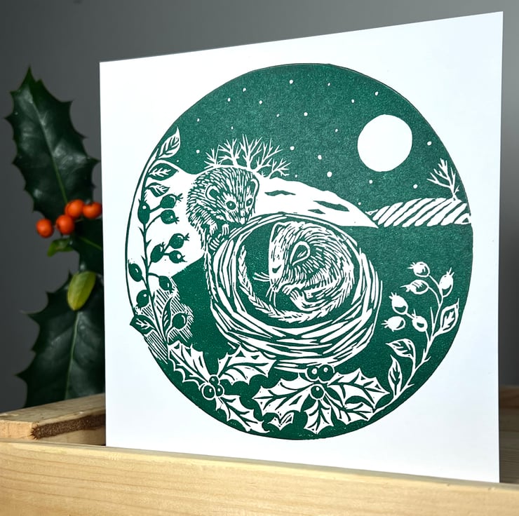 These Dormice in a winter scene are handprinted on card using a method called Lino printing. This is from a collection of four designs called ‘Under the moonlight’