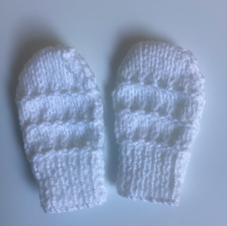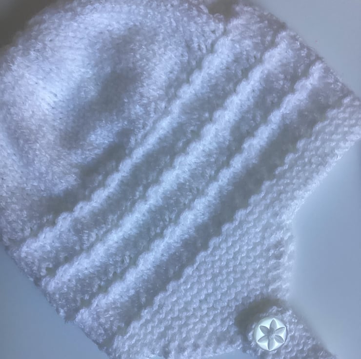 Lovely traditional style baby hat and mitts set hand knitted by me in my Suffolk home. Made in a white good quality baby yarn this sweet little set will keep a new baby snug and warm. The hat fastens with a matching white baby button and is suitable for a little boy or girl. Would make an ideal gift to welcome a new addition.