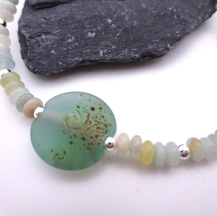 A bracelet made with amazonite gemstone beads, sterling silver beads and a handmade lampwork glass bead.