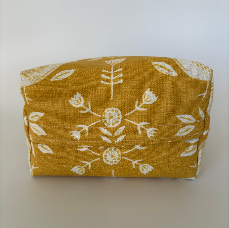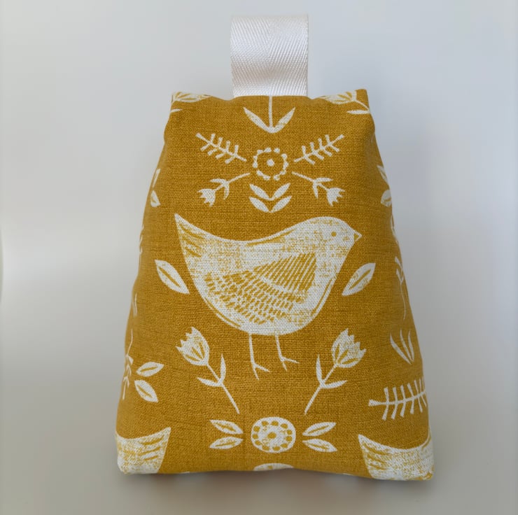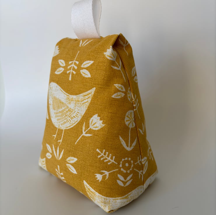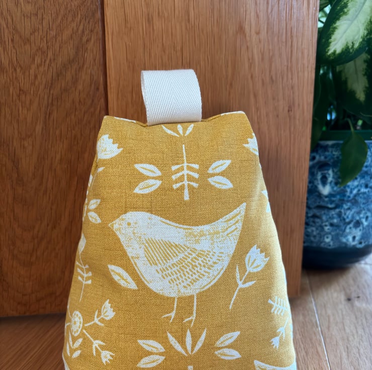 Tomas giftsHandmade cotton fabric doorstop in ochre with a Scandi inspired white bird and flower print.