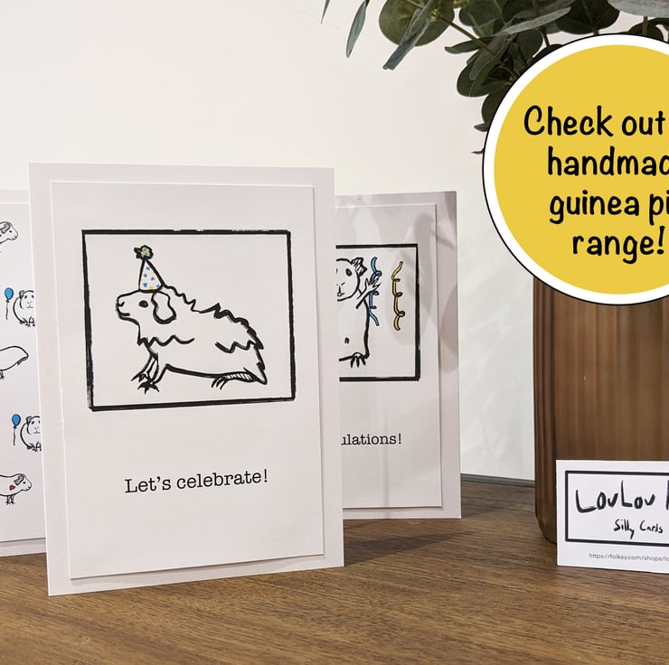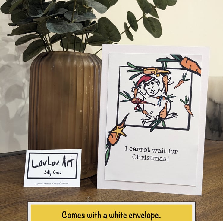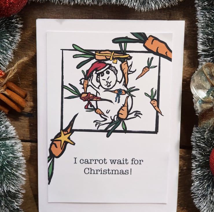 This card features a very happy guinea pig wearing a Christmas hat, with carrots falling from the sky. A perfect card for those who love guinea pigs!