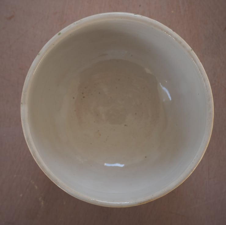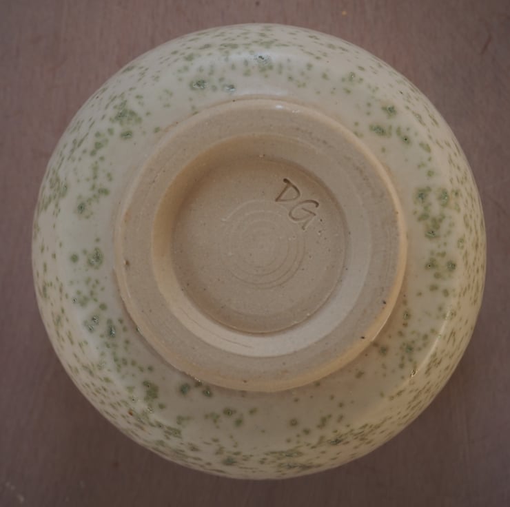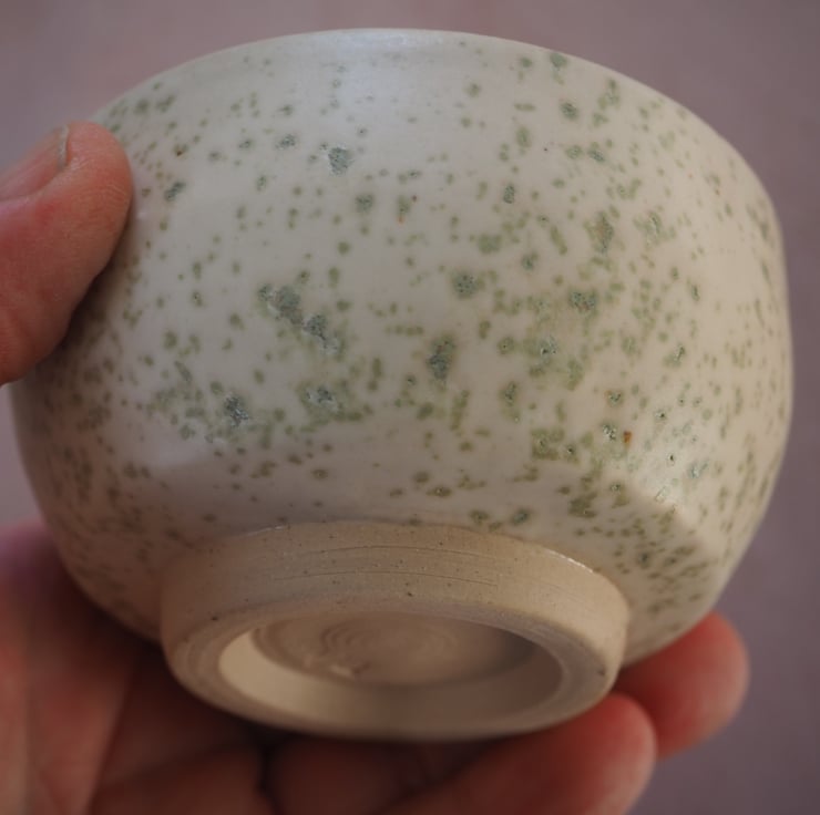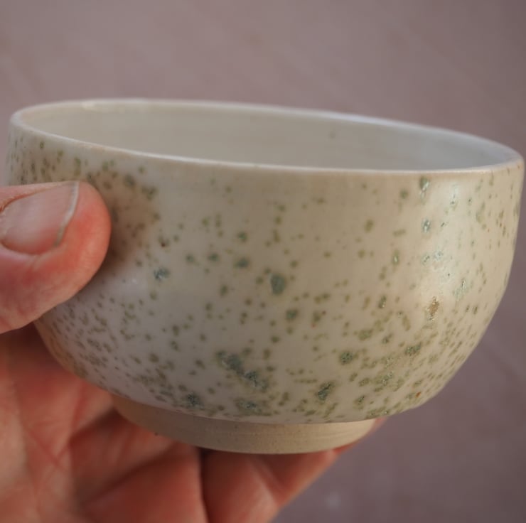 Tea bowl or also good for rice, sugar, sweeties etc. Hand thrown stoneware on my potters wheel and glazed in matt white with green crystals outside and a white glossy glaze inside.