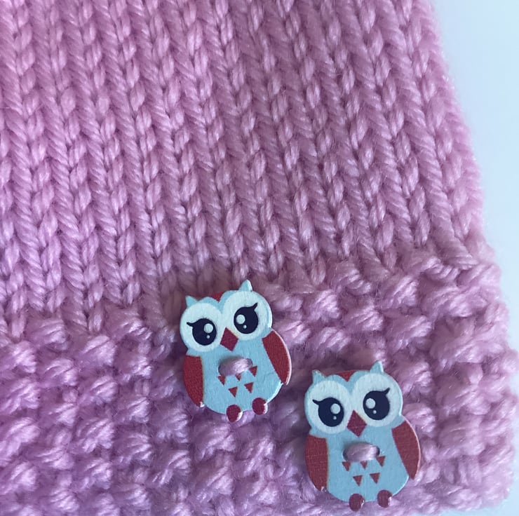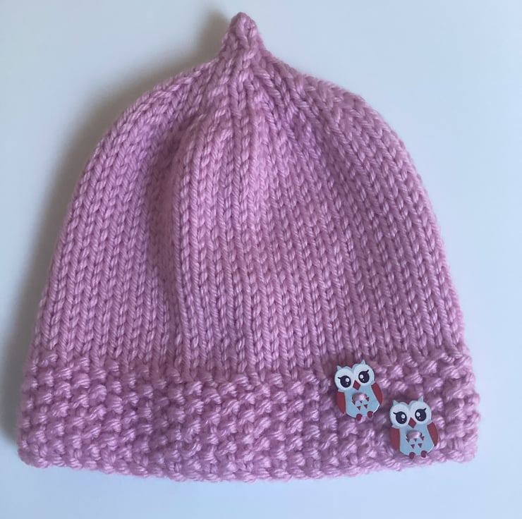 Very cute little pixie style hat hand knitted and designed by me in my Suffolk home. I have used a very soft merino and acrylic mix chunky yarn in a gorgeous dusky pink shade to knit this lovely warm hat that is decorated with two owl wooden buttons. Would make a very welcome gift for a little one. To fit from 3 to 12 months approximately.
