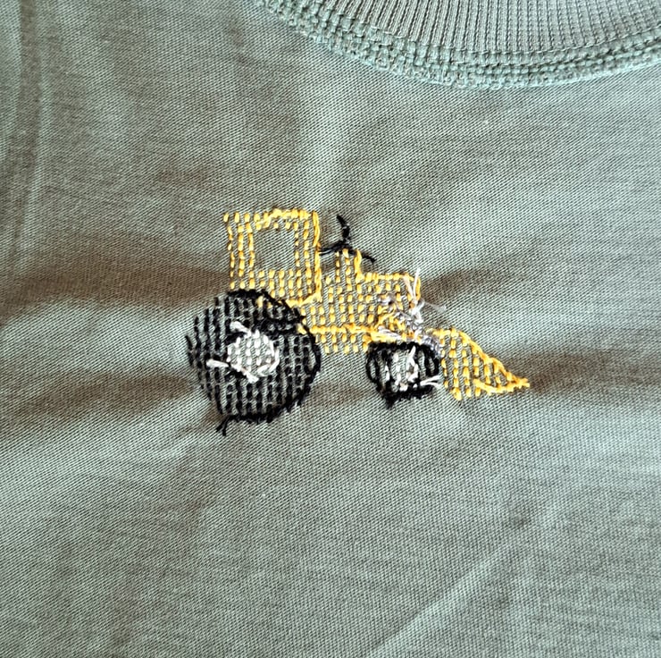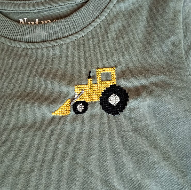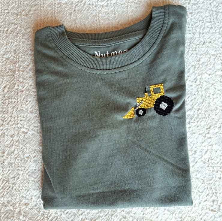 I have hand stitched a yellow digger on the left front of this olive green T-shirt age 3-4 years. As I never use a permanent backing material when hand embroidering kids' clothing, there is nothing inside to irritate your child's skin. The shirt has a round neck and short sleeves. It is all cotton, and can be machine washed.