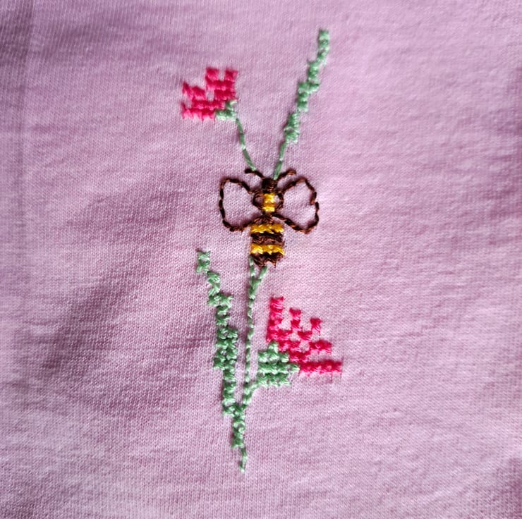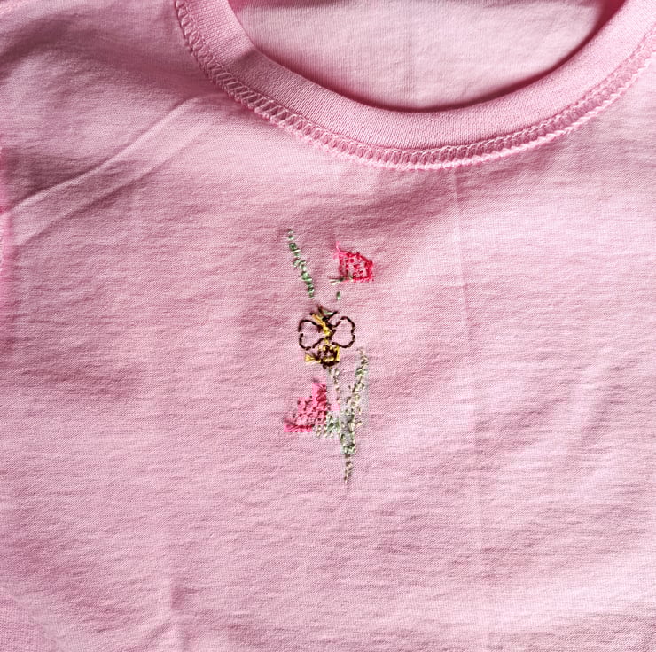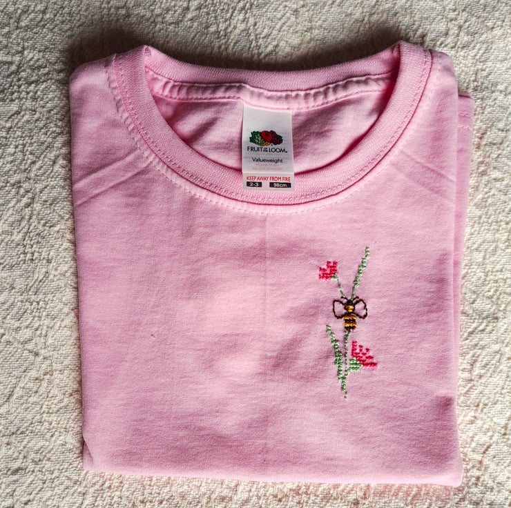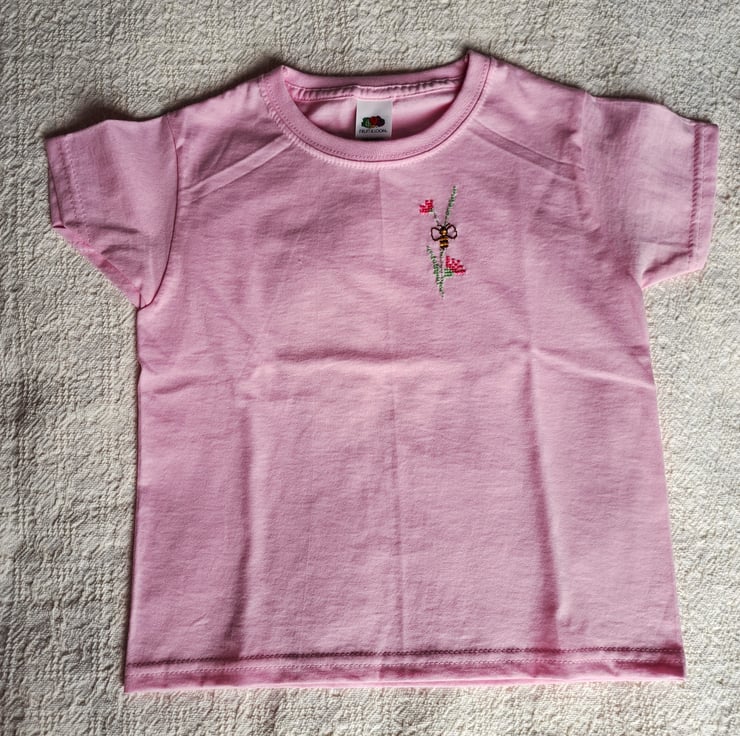 This is a very pretty light pink T-shirt by Fruit of the Loom, with a round neck and short sleeves. I have hand embroidered a brown and yellow bee on the left side, visiting a spray of toning but darker pink flowers. As I never use a permanent backing material when hand embroidering kids' clothing, there is nothing inside to irritate your child's skin. The shirt is all cotton and can be machine washed.