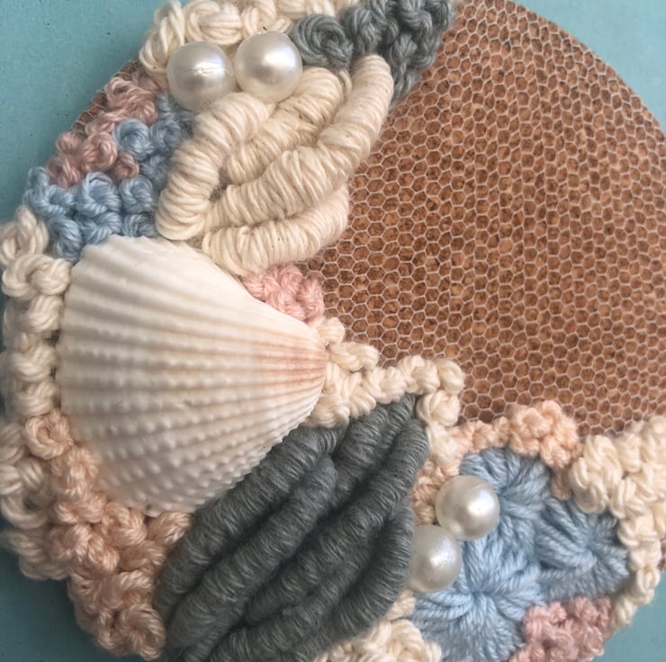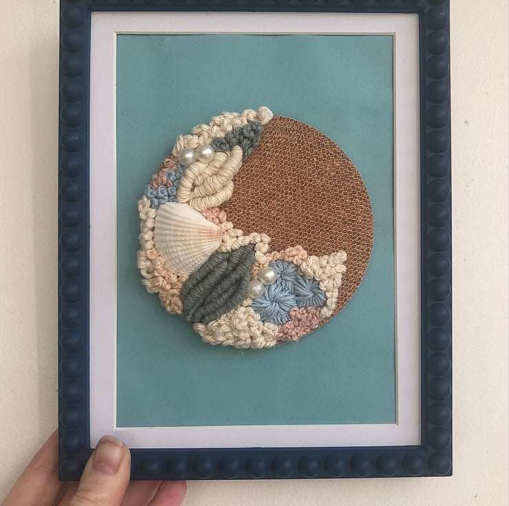Blue days a one of a kind framed art piece. Embroidery thread, yarn and beads have been hand embroidered onto a white tulle overlaid onto a cork disc. The piece has then been placed in a blue 8 by 6 inch frame to create a visually impactful piece which is the perfect addition to any home.