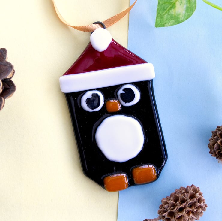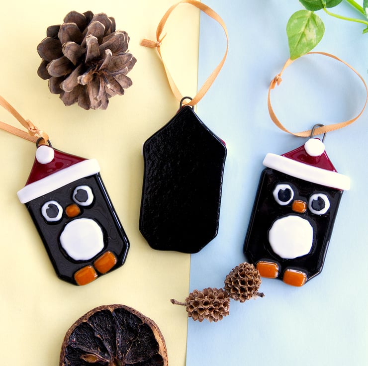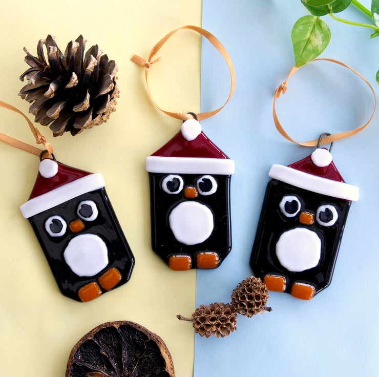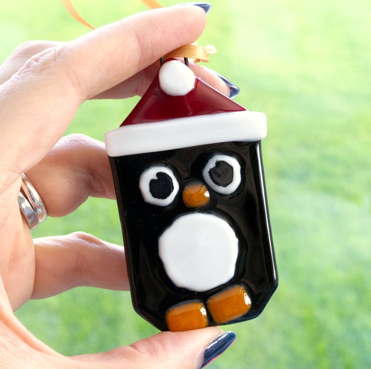 Cute fused glass penguin decorations. Each one has been cut by hand, assembled and hand painted before being put in the kiln for around 12 hours. They all come with a gold ribbon ready to hang on your Christmas tree.