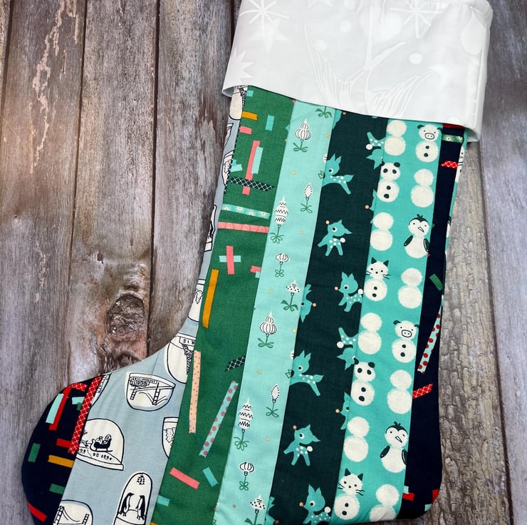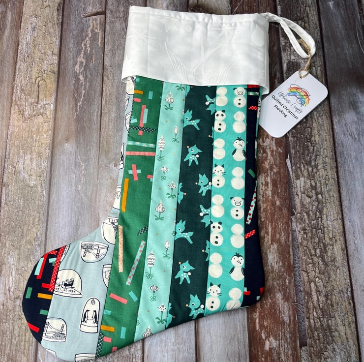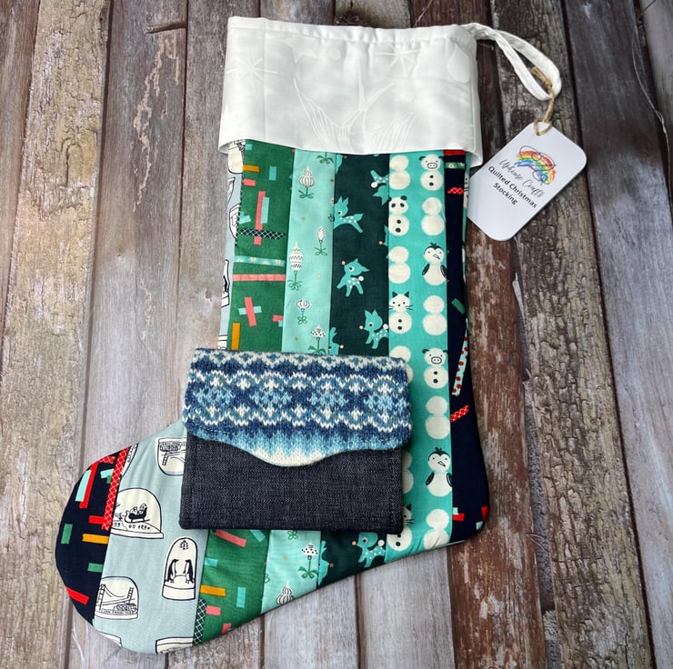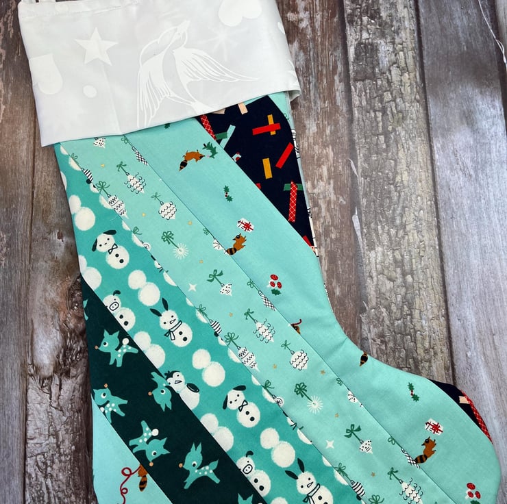 This quilted Christmas stocking is a hit among kids and adults. Featuring a charming white cotton cuff and contrasting quilted fabric, it measures H40cm from top of cuff to heel, with a W17cm body and 20cm cuff (all when laid flat). The hanging loop is 12cm from top of cuff to centre point of the loop.