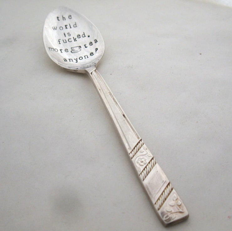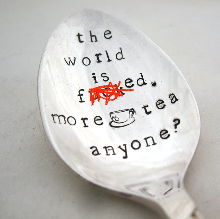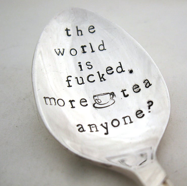A very British stiff-upper-lip response to all the awful things going on in the world right now: offer a cup of tea! I've hand stamped a little teacup picture and the words 'the world is f-cked. more tea anyone?' onto a vintage spoon. It made me laugh anyway, which was the point. Humour is very good as a coping mechanism. I hope it works for you too.