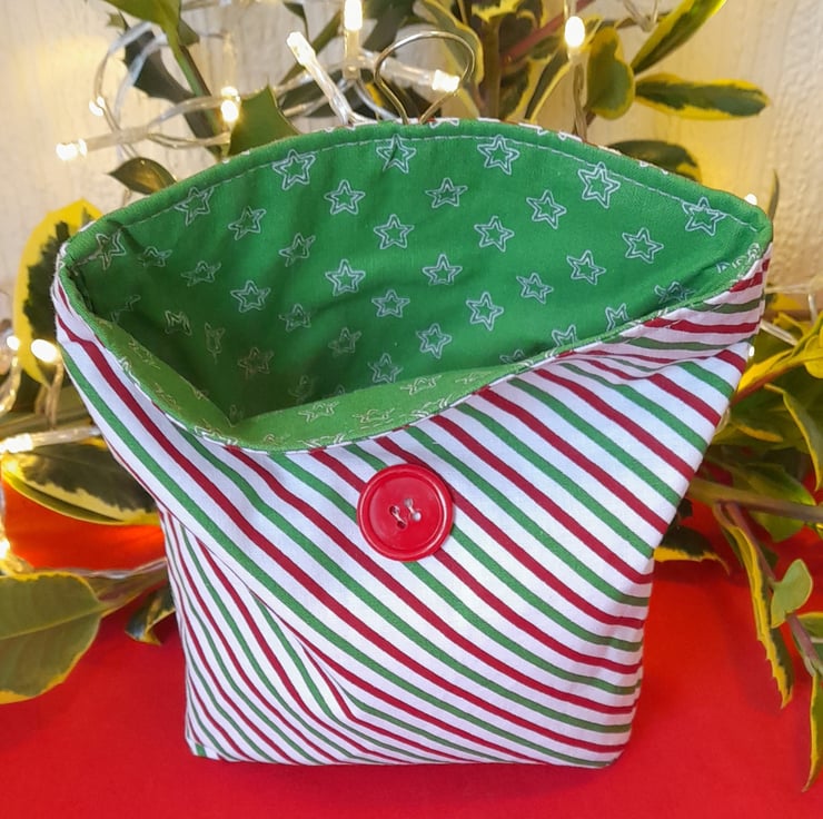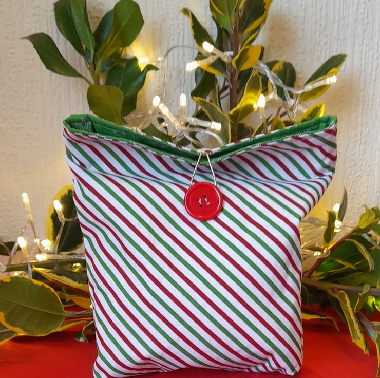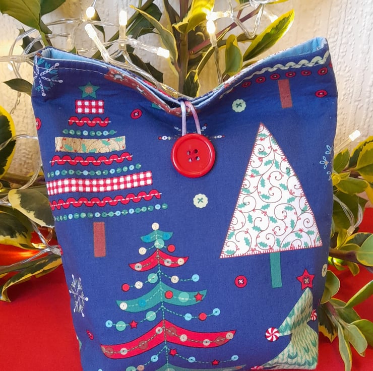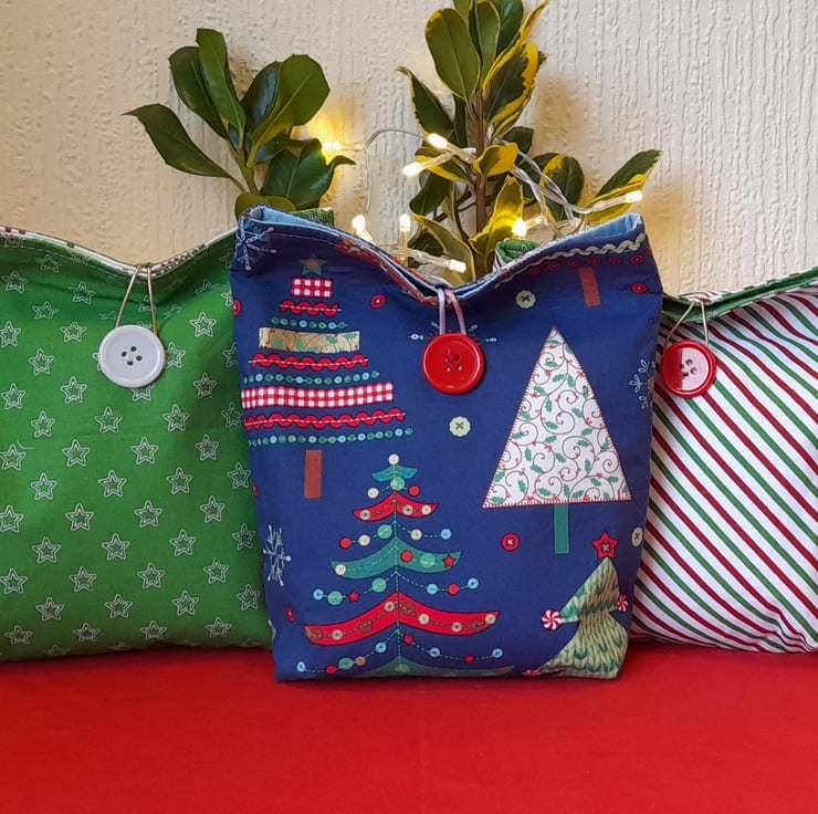 Delightful fabric gift bags that make Christmas gifts extra special. Each bags has been constructed from quality, cotton fabric, fully lined with contrasting festive fabric and with added interfacing to give structure. They have contrast button fastenings and a small box bottom for shape.