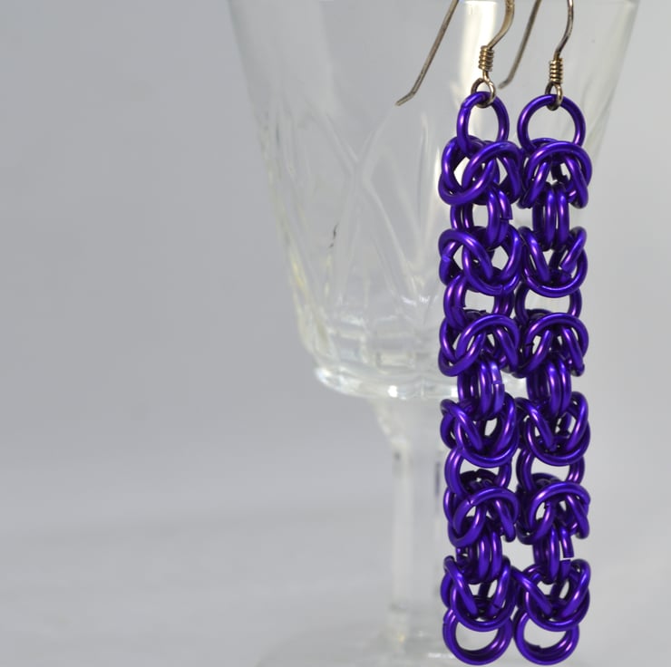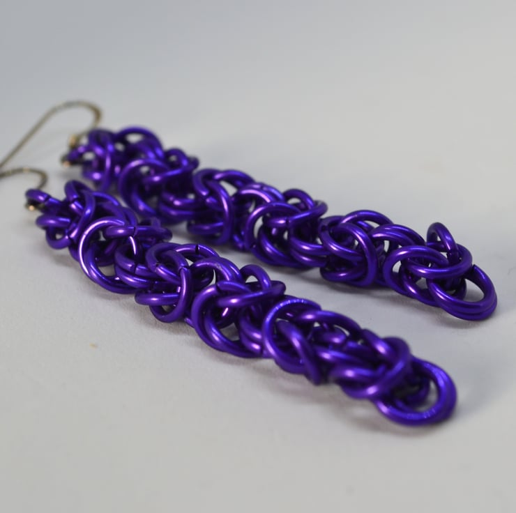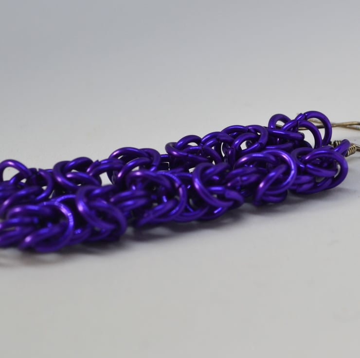 These beautiful purple chainmaille earrings are made using anodised aluminium jump rings in the byzantine weave. They are approx. 6cm in length from the base of the sterling silver ear wires. Although these earrings are long, they are nice and lightweight.