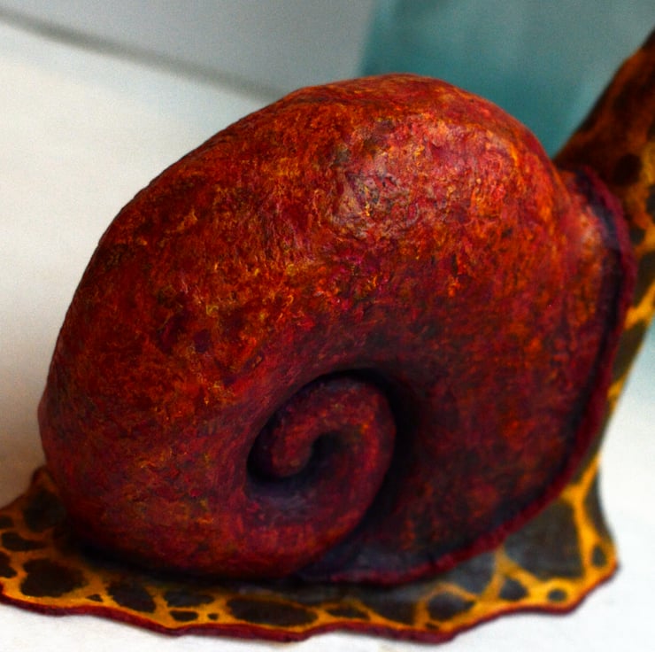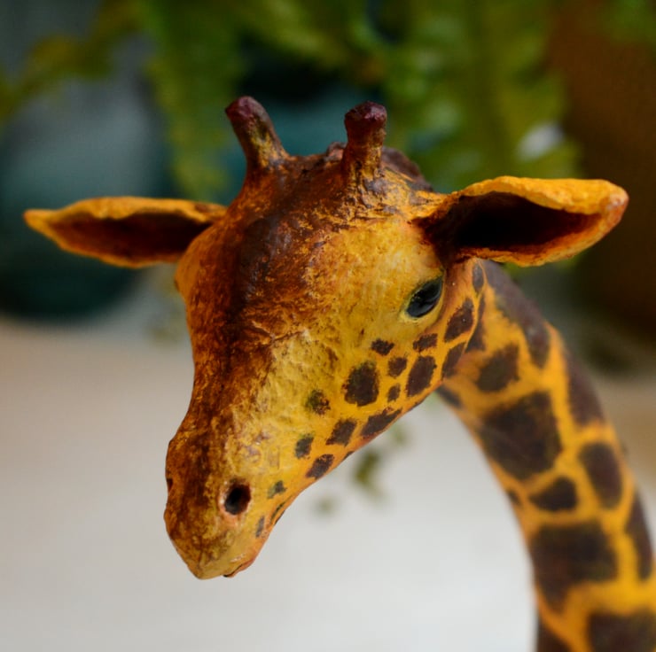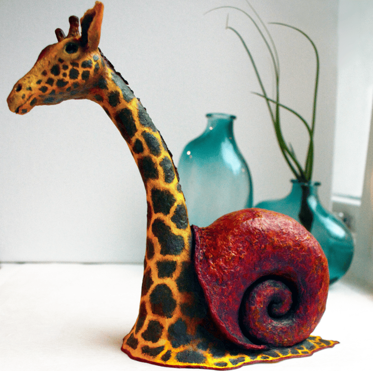 Of all the animals I usually sculpt, giraffes - with their long and graceful necks and interesting colour patterns - might be my favourite! This one lives in a brightly coloured snailshell, from where it has emerged to observe the world with a serene expression on its face.