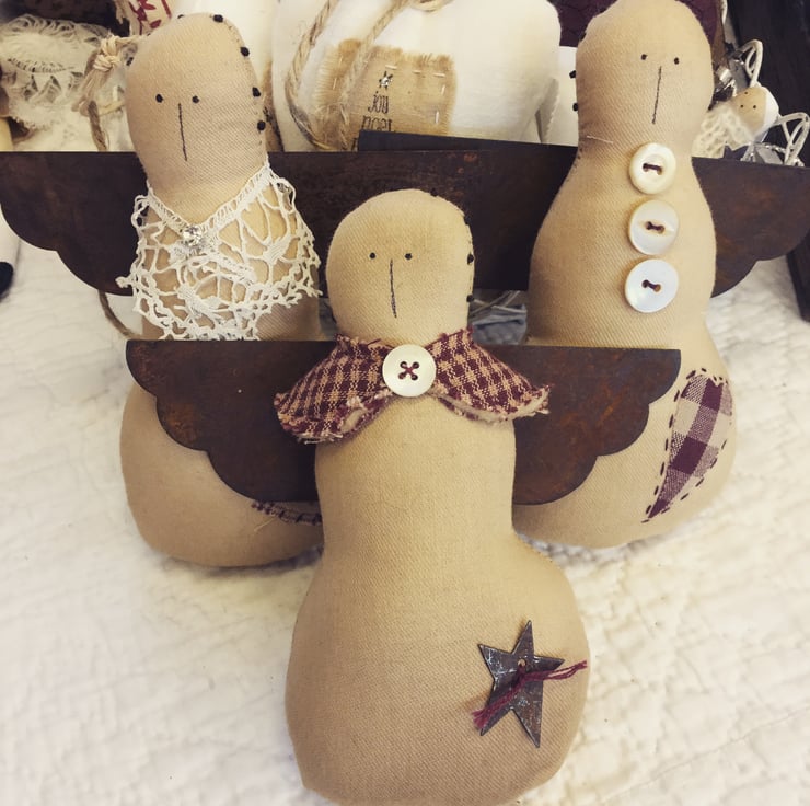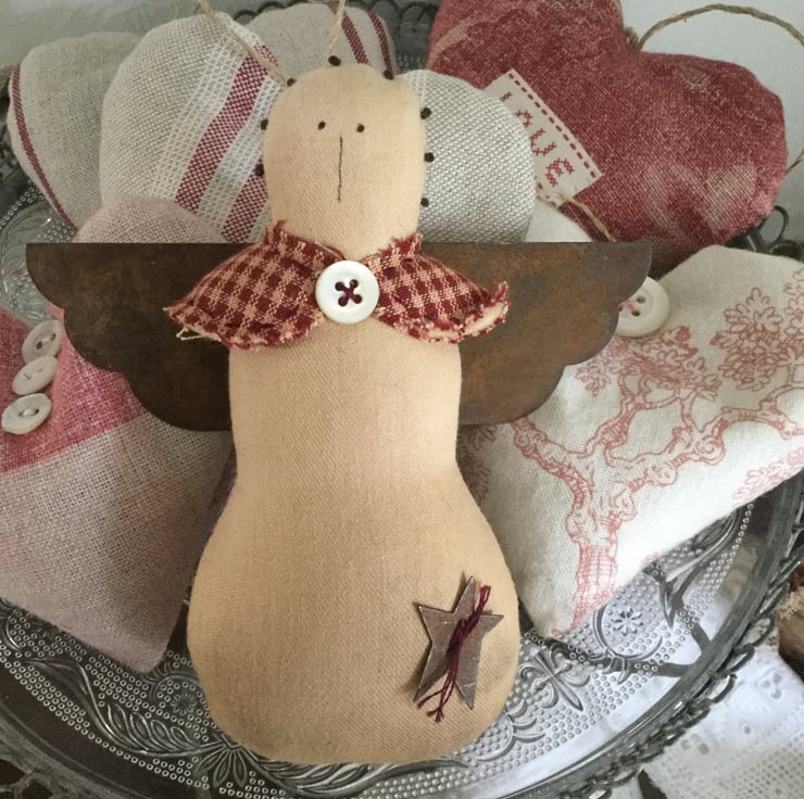 A primitive angel with rusty tin wings, makes a lovely Christmas decoration, but is suitable for display throughout the year too.