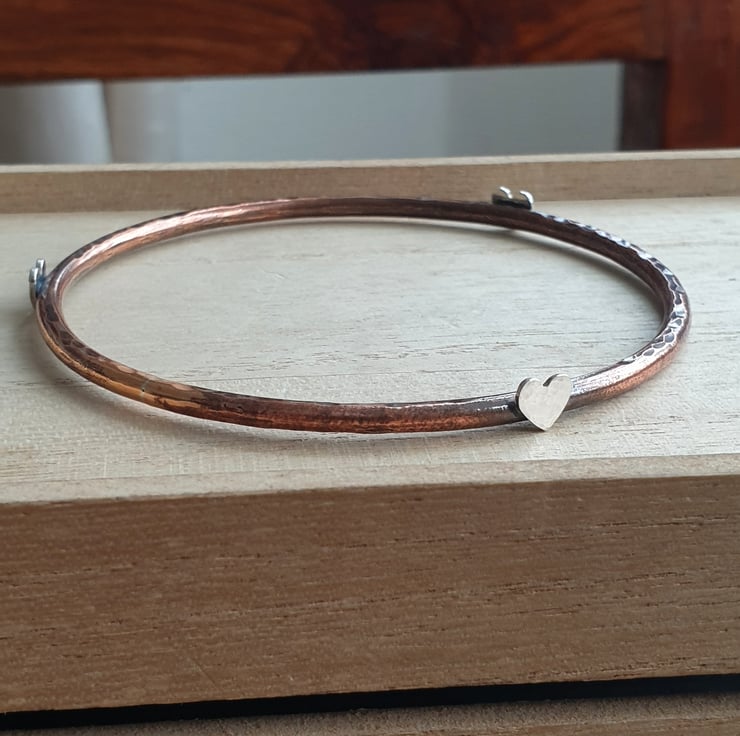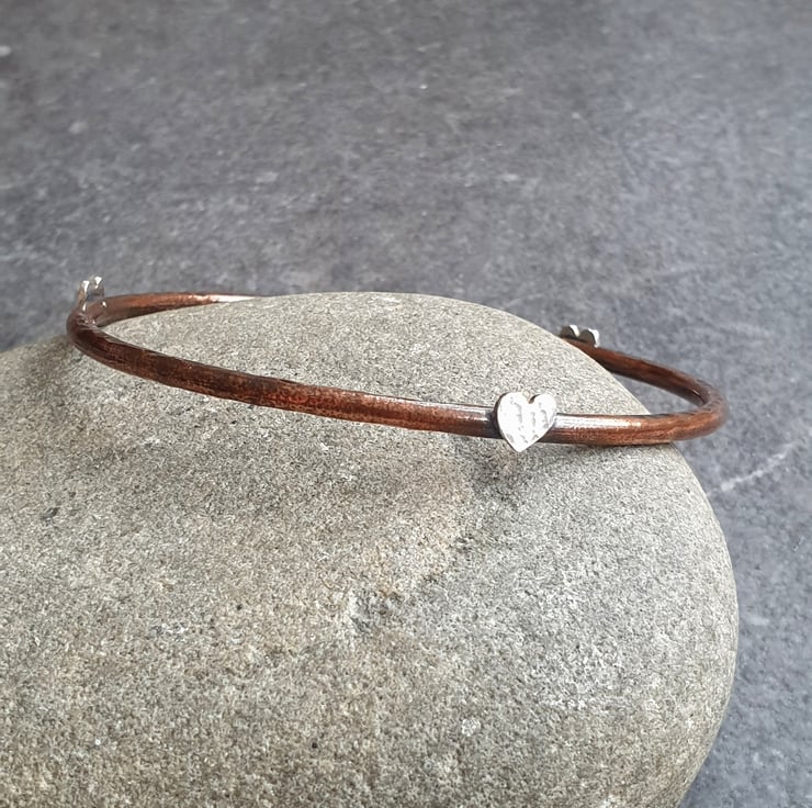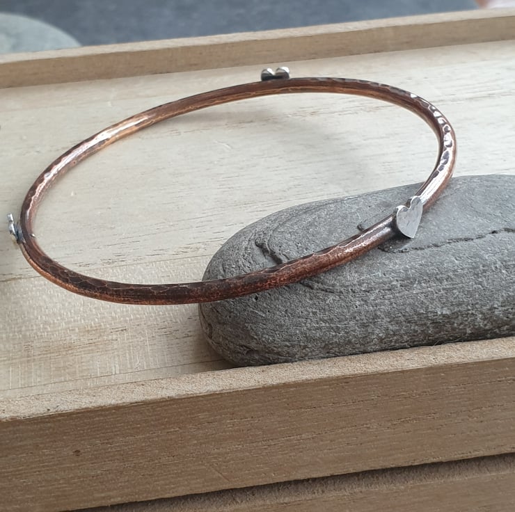 This unusual copper bangle has been handcrafted from sturdy solid copper wire with three sterling silver hearts soldered around the edge. The copper has been lightly hammered around the rim, and then oxidised and burnished to a subtle sheen. The silver hearts have been left bright and shiny for a lovely contrast with the copper.