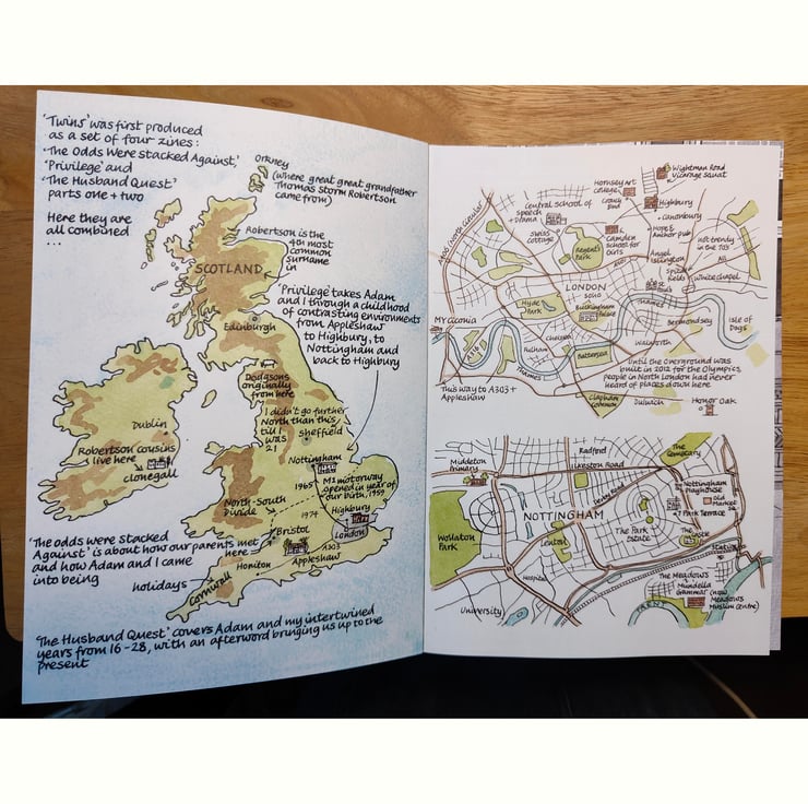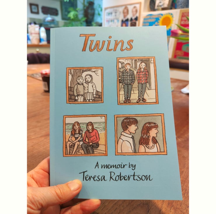 Twins is a 146 page, perfect bound, 24 x 17cm full colour graphic memoir journeying through Teresa's life and that of her twin brother Adam until age 28 when tragedy struck as Teresa was about to give birth to her first child, Callum.