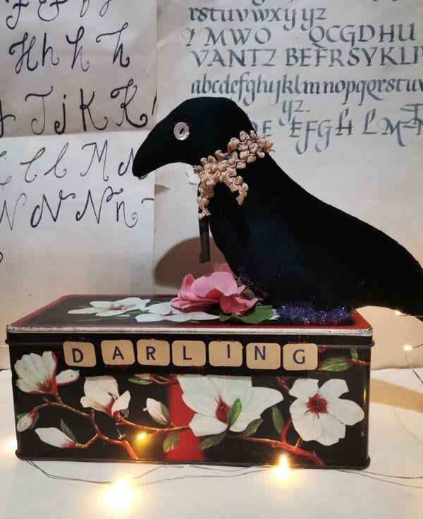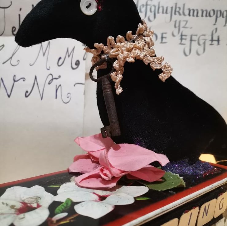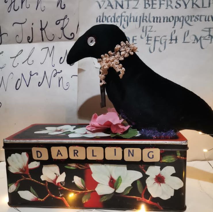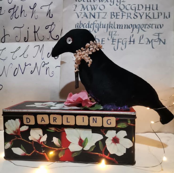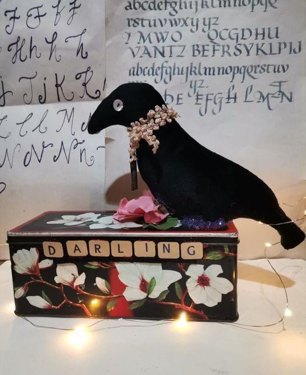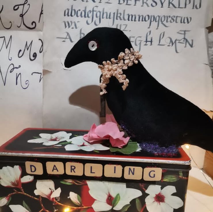 A textile art bird sculpture. A black velvet bird handmade using lovely black velvet.