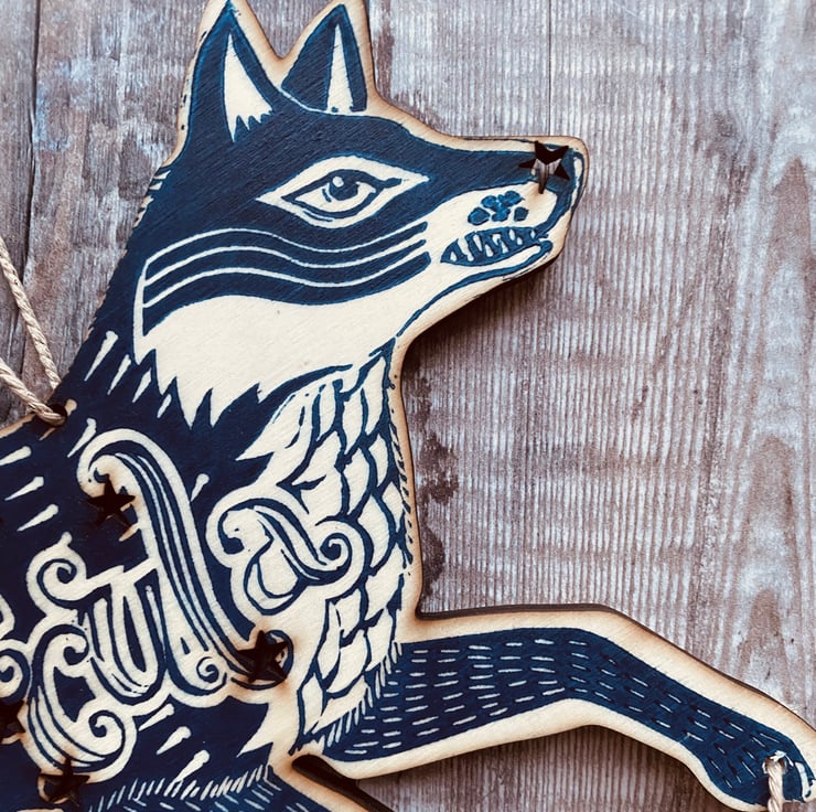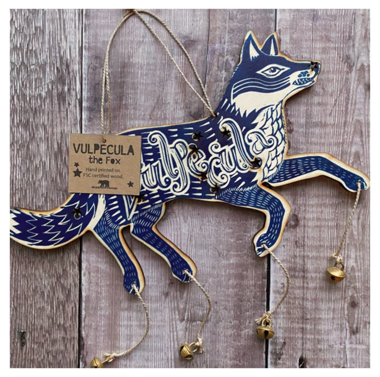 The next in my series of Celestial Creatures! Vulpecula the Fox joins the gang, proudly sporting his constellation laser cut into wood. This design is a Linocut; I hand press all my creatures on a lovely old Albion Press in Salford. He measures approximately 25cm across and is strung with four Indian clawbells. A coat of spray varnish keeps him looking smart. He will be sent carefully wrapped in his own special box by first class post.