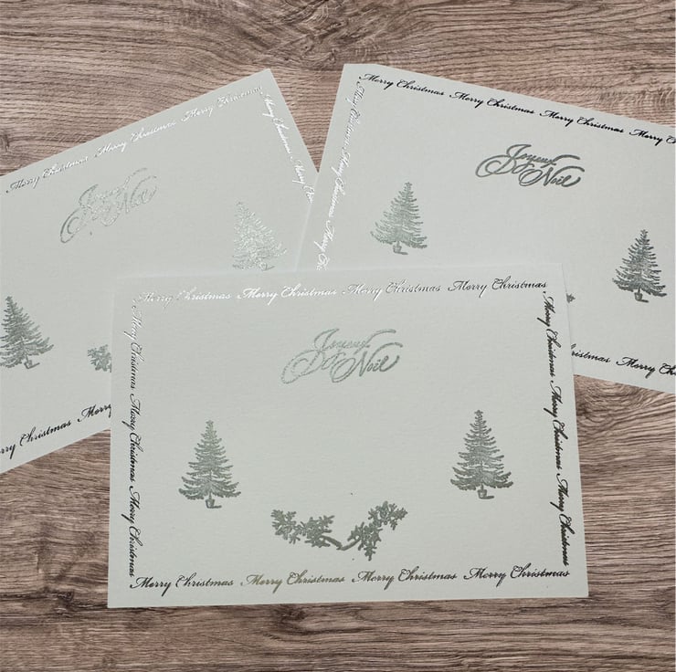 Set of 3 Luxurious printed edge silver & white cards with inserts. Joyeux Noel