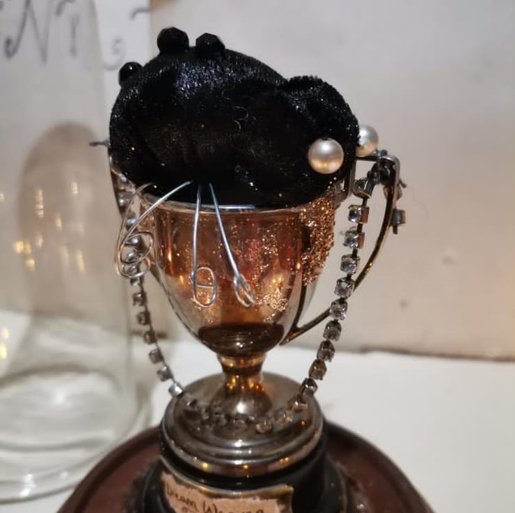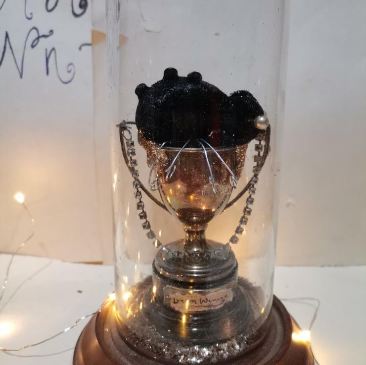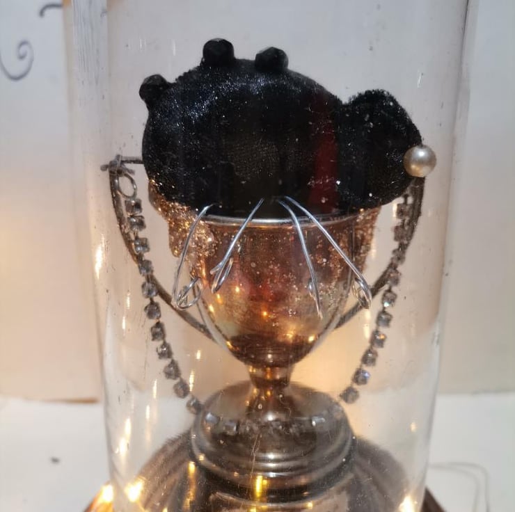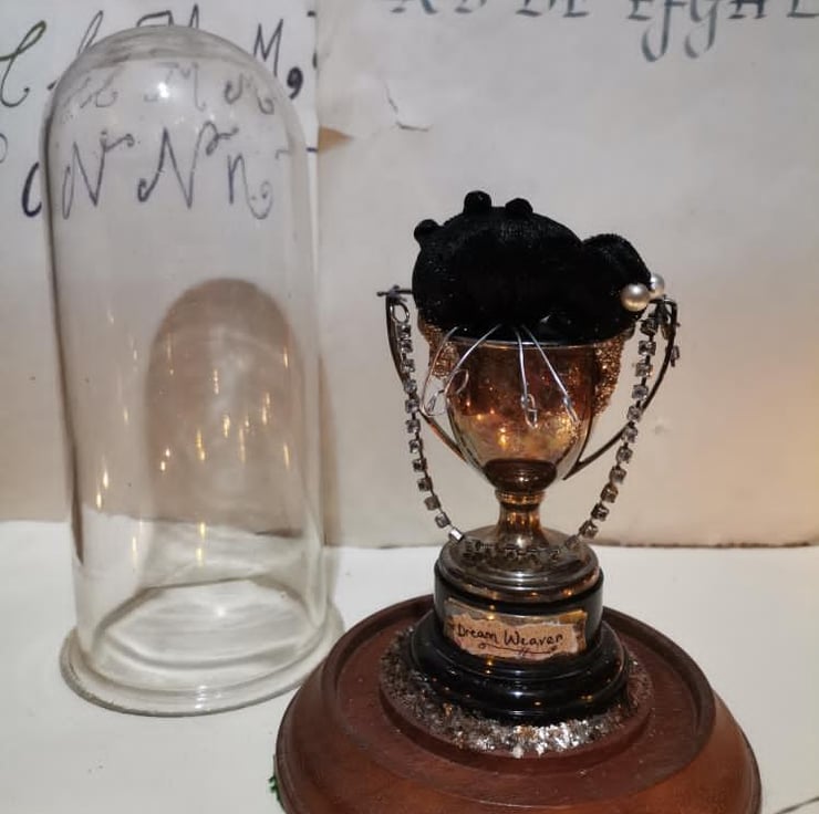 A mixed media, textile art sculpture created in a vintage glass dome.