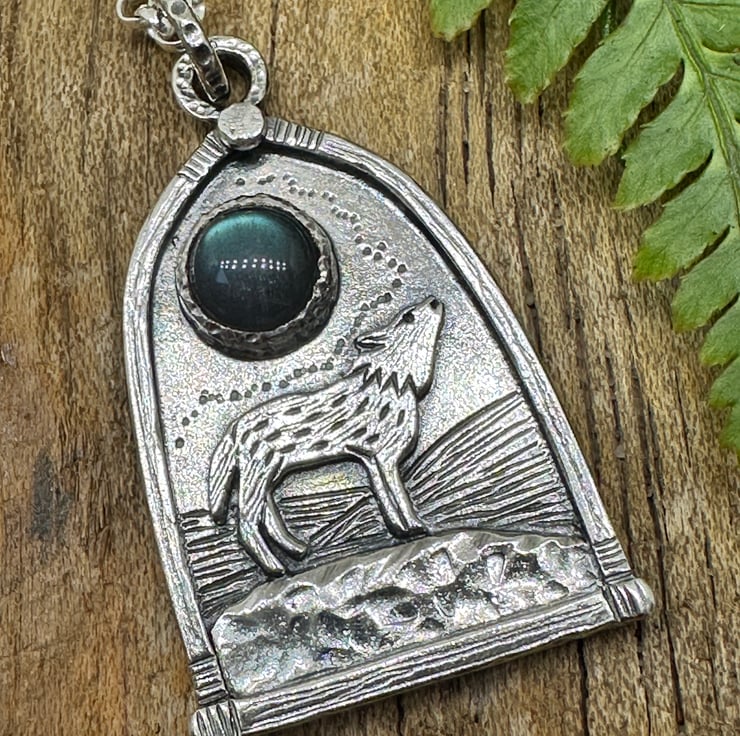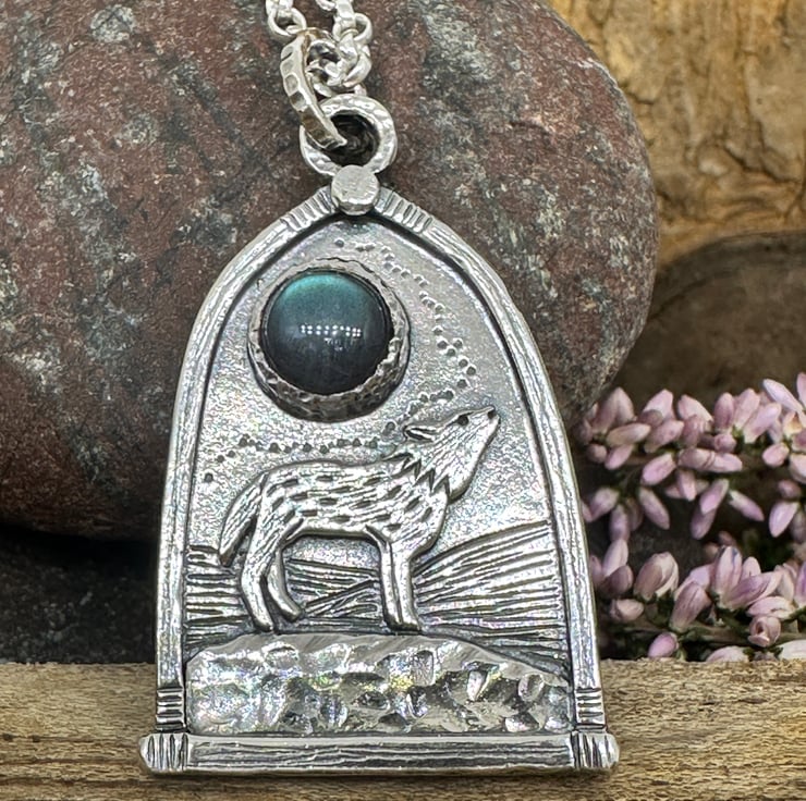 A wolf pendant, harking back to a time when wolves roamed freely through our ancient landscape.