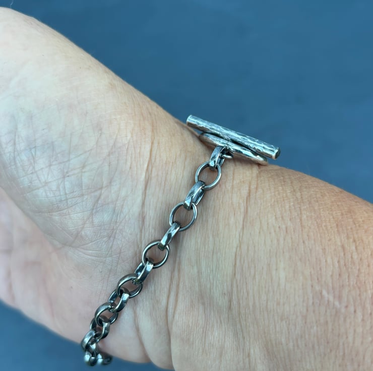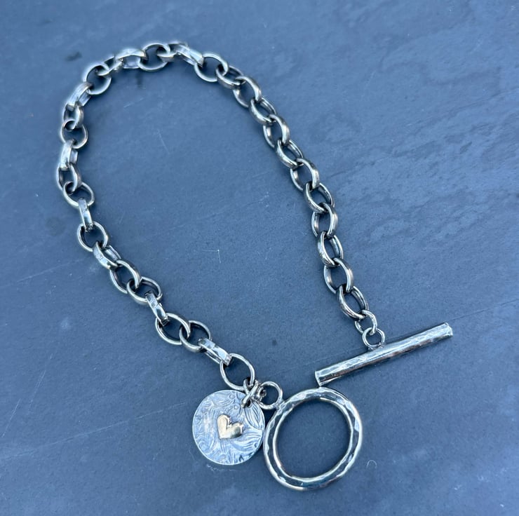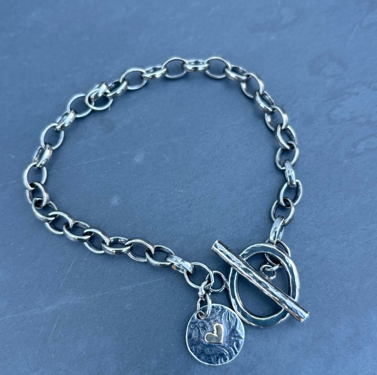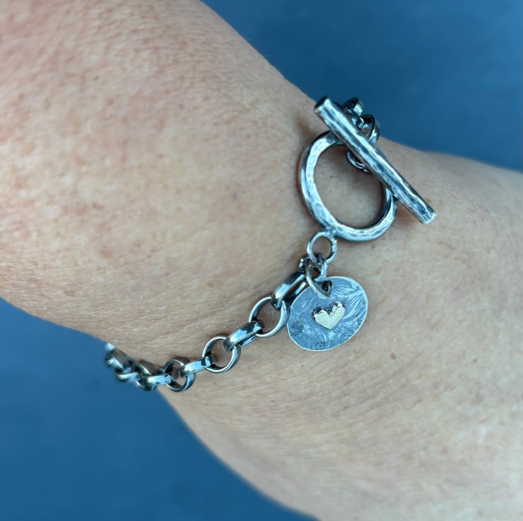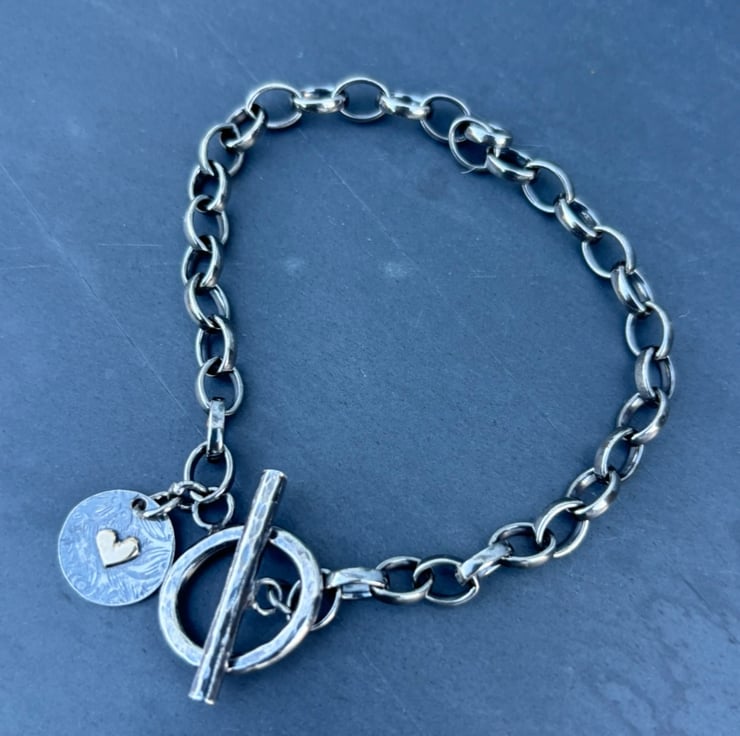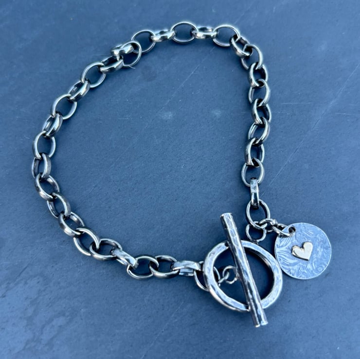 This fob bracelet is made from oxidised Sterling Silver and features a silver heart locket as well as a gold heart round charm. It has a toggle clasp. The belcher chain links each measure approx: 6mm in length. The bracelet fits a medium size wrist and measures 8 inches , please let me know at Checkout if you need a different length. Also please let me know if you would like it high polished silver as opposed to the oxidised finish.