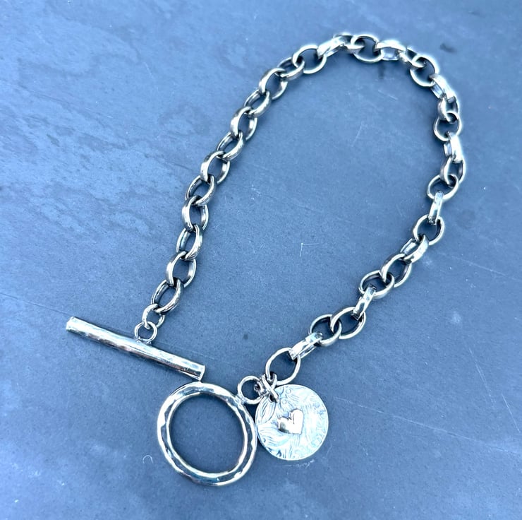 Silver Fob Bracelet, gold heart bracelet, toggle bracelet, t bar bracelet, love,