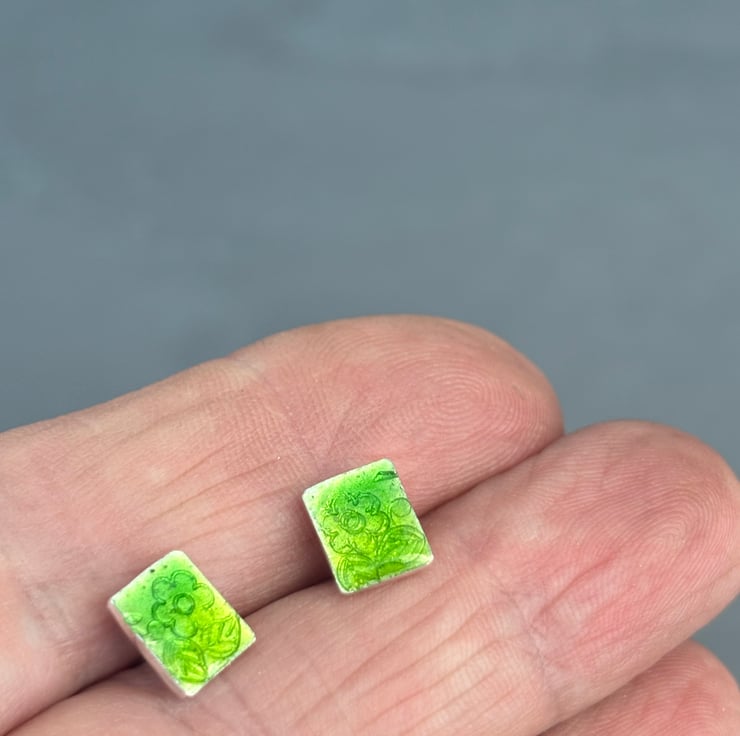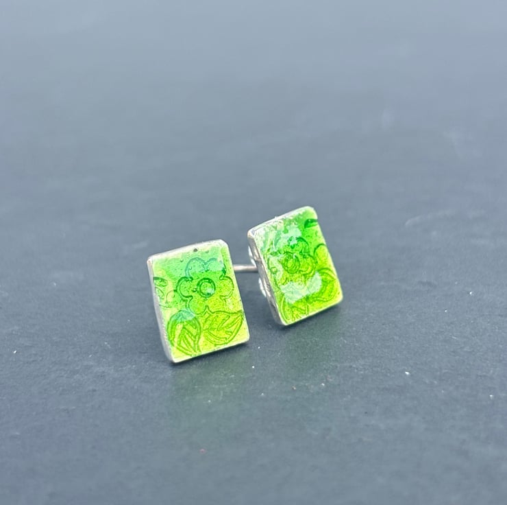 These Enamel Studs are made from Sterling Silver and green enamels. Beneath the enamel is a flower and leaf pattern and the backs are shiny silver. The studs measure approximately: 8 x 6mm but if you would like a slightly different size please message Michelle. The posts and push on backs are also Sterling Silver.