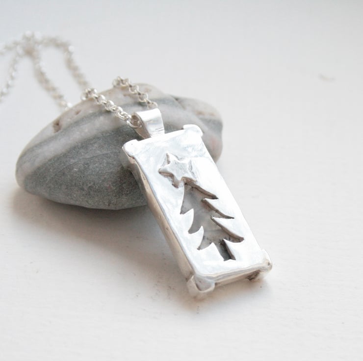 For an added touch, the back of the pendant features a delicate Christmas tree cut-out, allowing a bit of light to pass through the stone, highlighting its natural beauty when held up to the light.