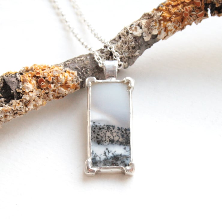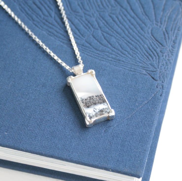 This dendritic opal pendant is handcrafted in recycled sterling silver, making it a sustainable and unique piece. The dendrite opal’s natural black-and-white marbling creates an effect like a winter landscape, creating an ideal gift for those who appreciate the beauty of nature—especially for Christmas.