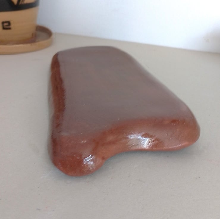 Thisis a very unique plate or serving platter which would suit the serving of hot or cold food and snacks. Could be used as a decorative small display dish. Made by hand in the slab Pottery method from red terracotta clay with an inlaid cream white outline of an Aztec, Inca stylised bird. Measures 20 cms long x 11 cms wide x 2 cms deep. Glazed in a clear leadless glossy glaze finish, Suits hot or cold food serving. Dishwasher and microwave safe.