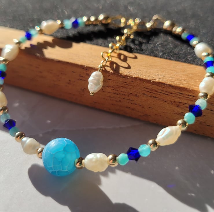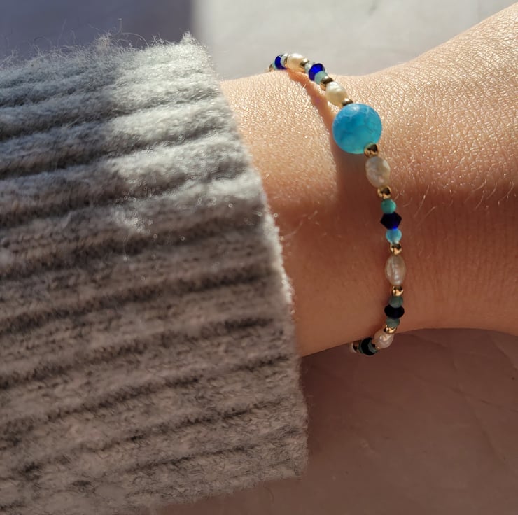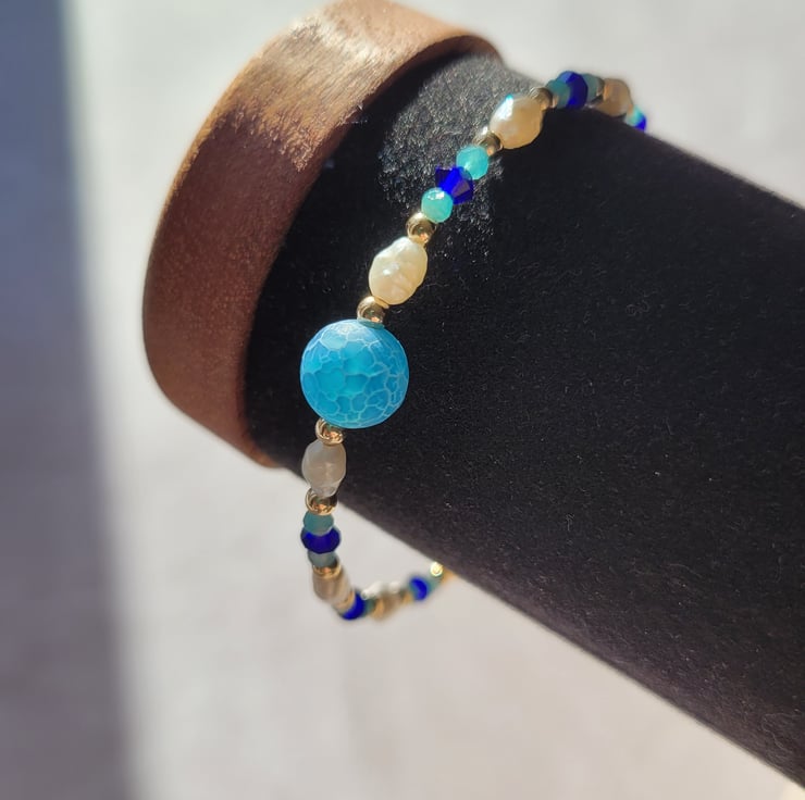 Blue gemstone and pearl gold filled bracelet handmade in Aberdeenshire, Scotland. The large, centre bead is semi precious frosted, cracked agate.The smaller blue beads are cobalt blue Preciosa crystals which sit between Amazonite gemstone beads. The blues are complemented by freshwater pearls and gold filled beads. The bracelet is finished with a gold filled spring ring clasp and extension chain with a variable length of around 17-20cm. I use high quality, strong, flexible beading wire and all components are gold filled.