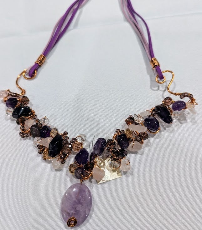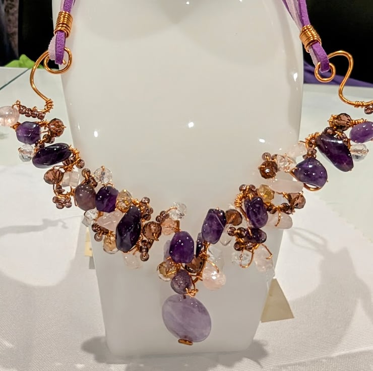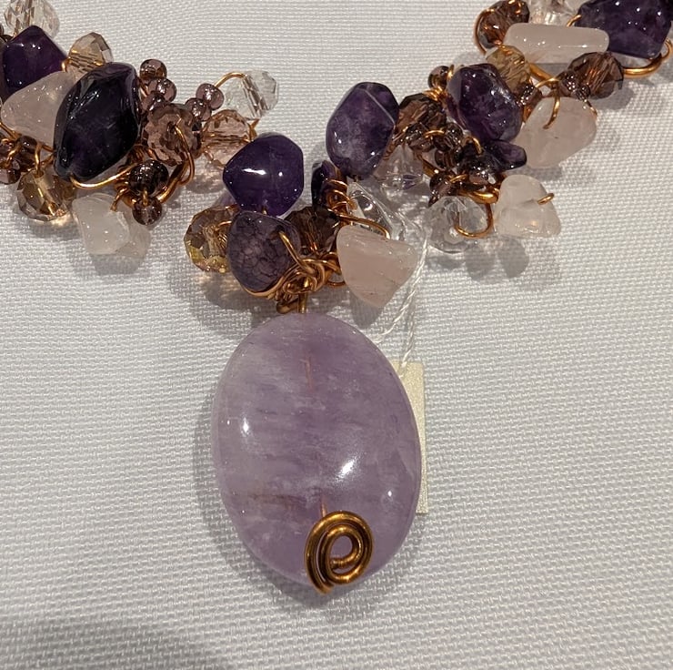 A beautiful amethyst, rose quartz & Chinese crystal necklace,the semi-precious stones wrapped onto a non-tarnish copper frame, showcasing an oval amethyst 30mm x 20mm.. The wire frame hangs from a purple & pink faux swede thong, fastened by a non-tarnish copper hook and eye. The necklace measures 62 cms (24.5 ins).