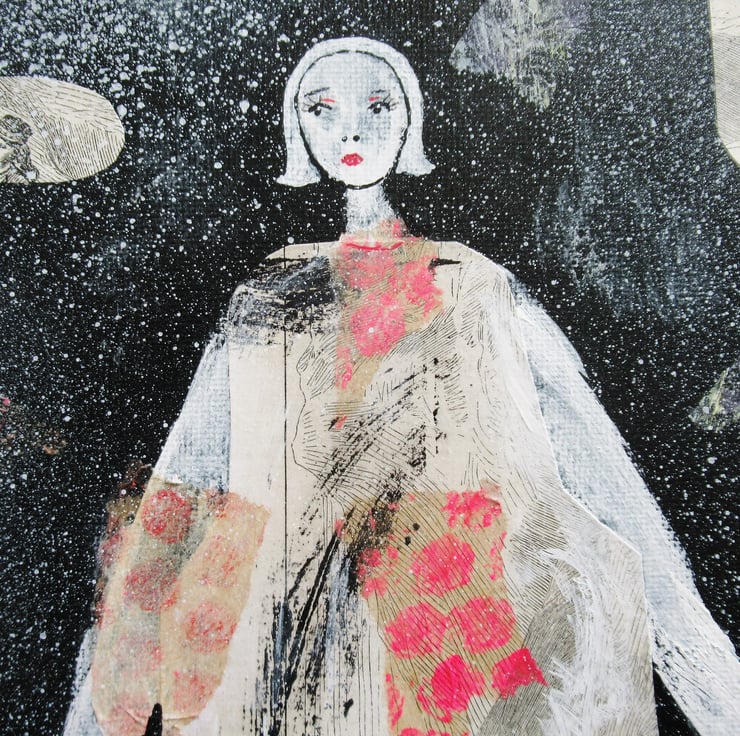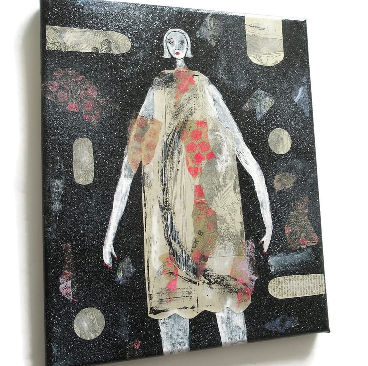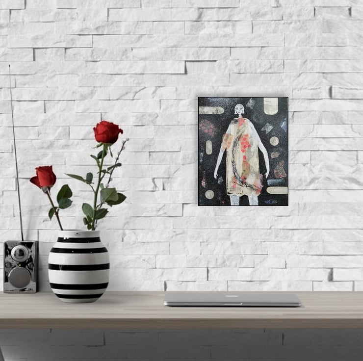 Figurative artwork in acrylic, collage and drawing pens on 10 x 12 inch stretched canvas with painted edges so no frame is necessarily. Naive style painting which would make a striking focal point in any interior. It has a soft sheen surface finish and is signed up the edge by Bea.