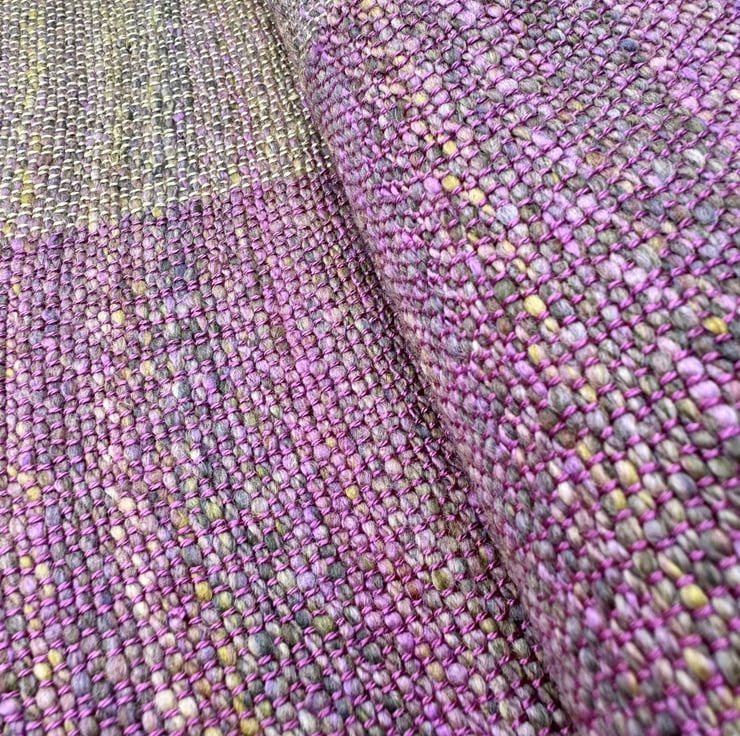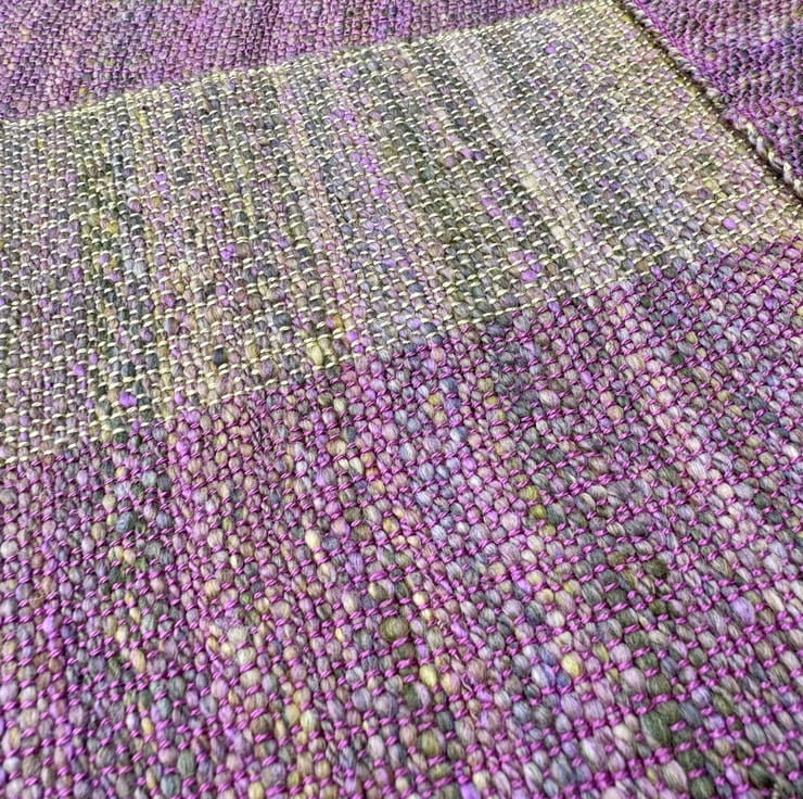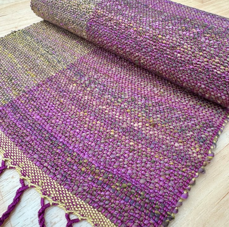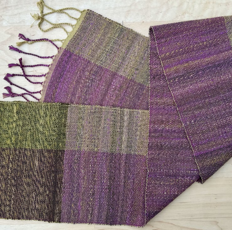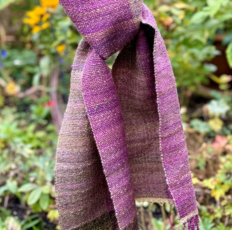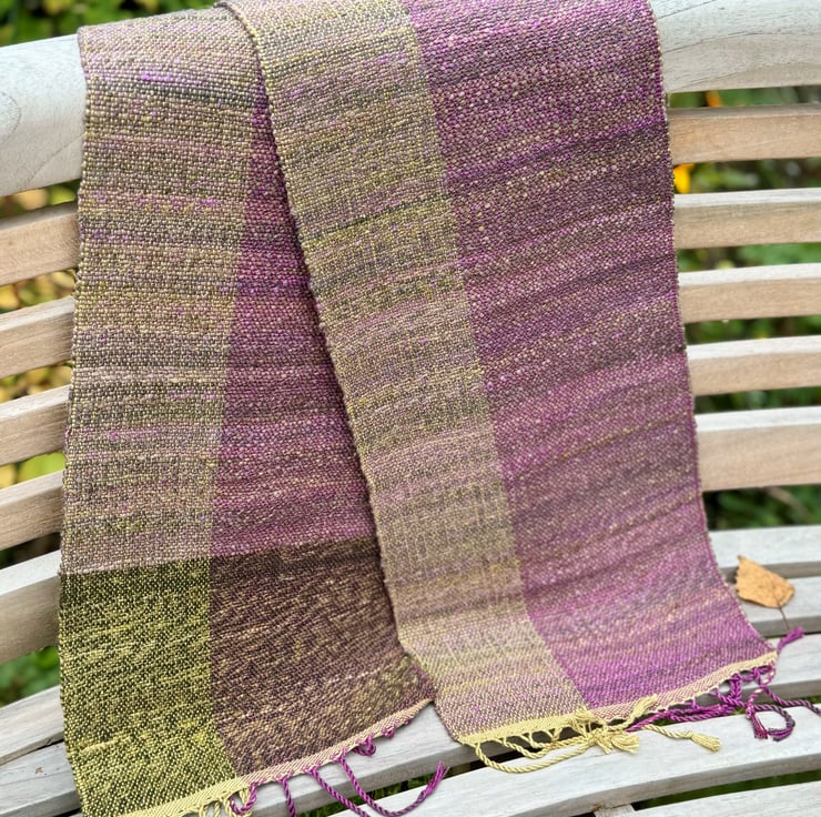 A lovely hand-woven scarf, ideal for warming shoulders or necks during winter and autumn. It is hand-woven using a home-spun yarn that mixes 85% merino wool and 15% silk in deep moorland colours of purple heather and greens. Subtle variations in the colour of the weft come from the hand-spinning of the wool/silk mixture, so the mottled colours change and vary along the scarf, ending with a broad band of deeper green at one end. This weft is woven in a plain weave onto a warp of Tencel yarn (a sustainable yarn similar to silk) in matching colours; with over half the warp reflecting the deep purple, and a broad border of green at one side. The scarf is 137cm in length (excluding the tassels) and 23cm wide. Hand-wash carefully at low temperature and lie flat to air dry.