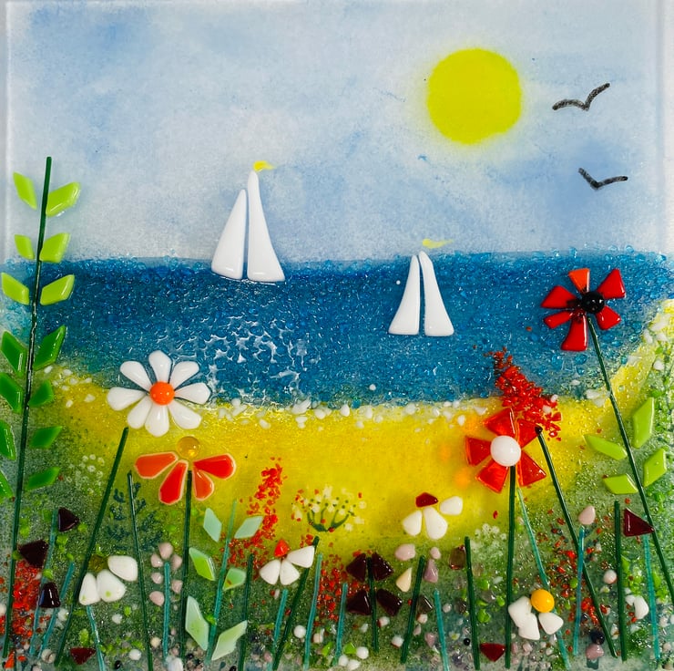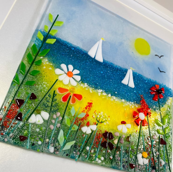 Gorgeous bbeach landscape evoking the feeling of tranquility . This picture is both vibrant and tranquil . Created over multiple kiln firings and one of a kind .
