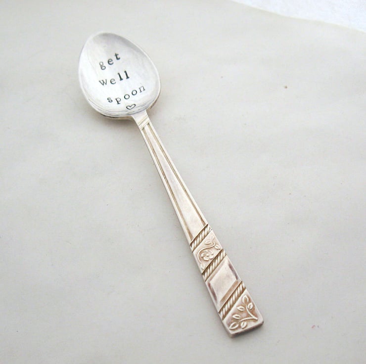 A hand stamped vintage silver plated floral coffee spoon with 'get well spoon' in black lettering in the bowl, along with a tiny heart. It's approximately 13cm long. A thoughtful little gift for a friend recovering from illness or injury.