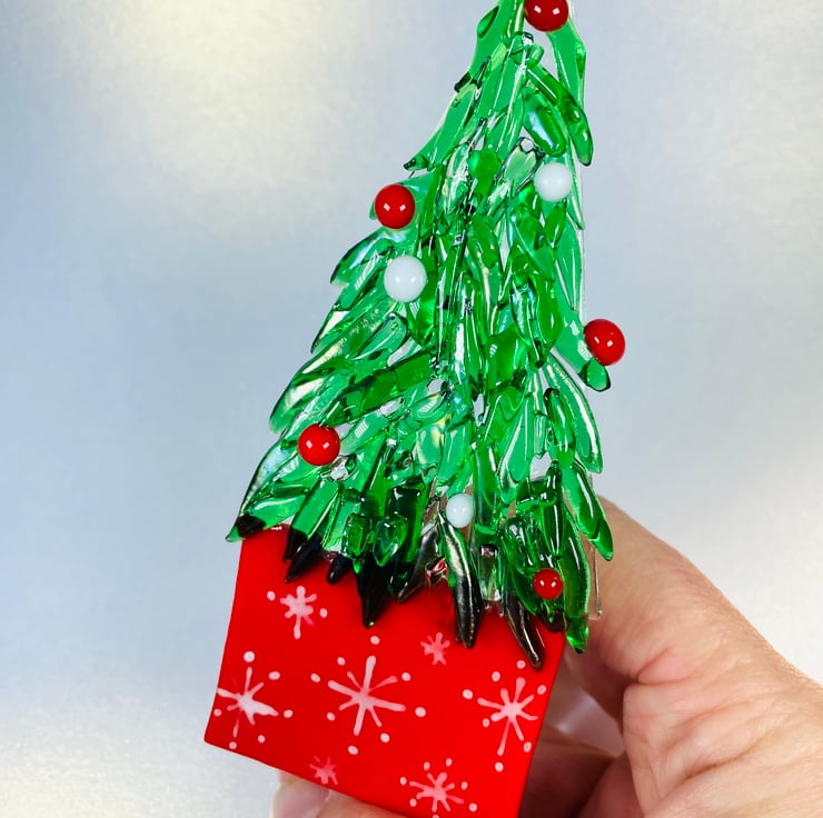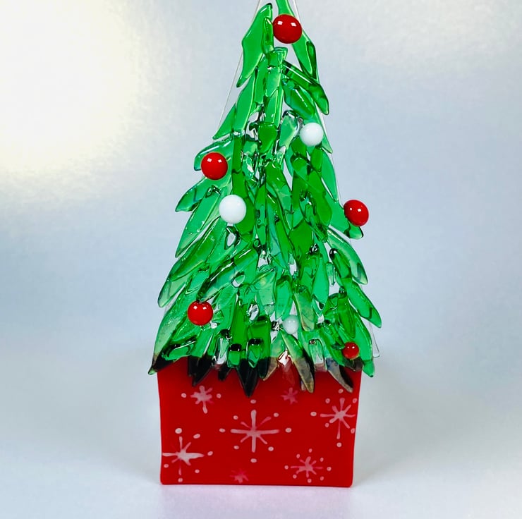 Gorgeous textured Christmas tree which can be back lit in the evening for added interest to your Christmas decor . There is only one available . They stand approximately 7 inches tall and are attached to a glass candle holder . The tree is made by making tiny cuts in art glass and beautifully, assembling and putting in the kiln firings 12 hours . A stunning addition to any shelf , windowsill or mantle .