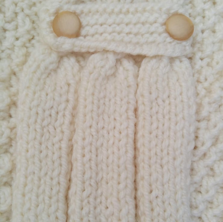 Hand knitted frock coat for babies and children made using aran yarn to give the coat some weight to make it warm for chilly days. It has delicate cable patterns with moss stitch and it is fastened using 6 buttons in a double breasted fashion.