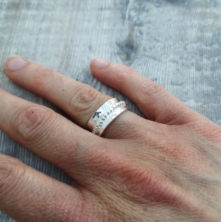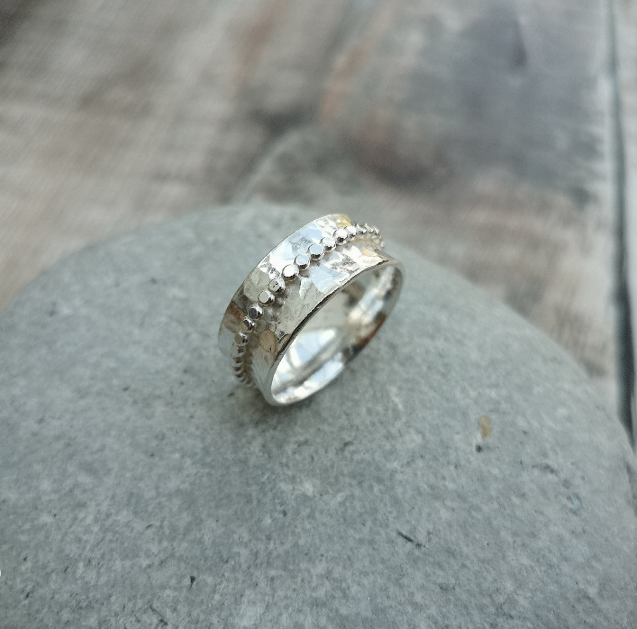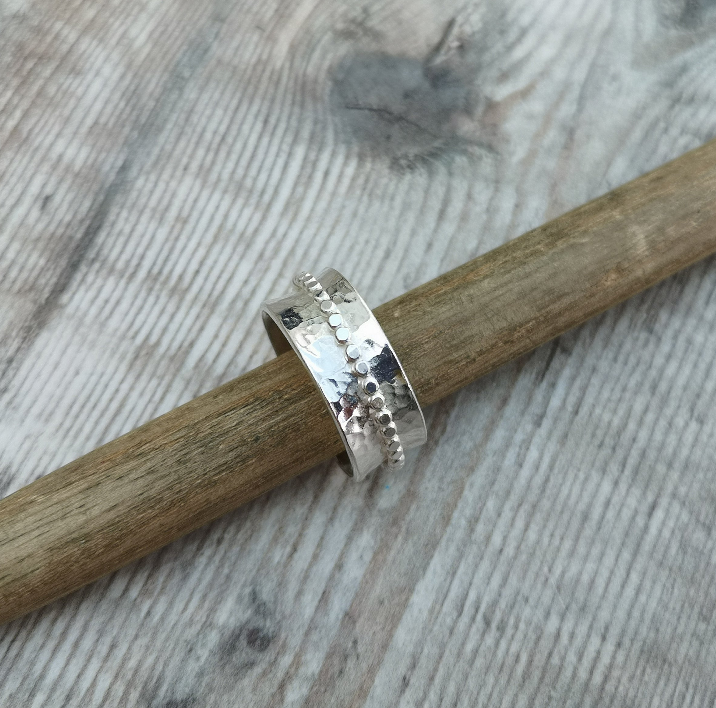 This handmade sterling silver spinner ring features an 8mm wide band with a beautifully hammered surface that adds texture and depth. The beaded spinner detail provides a playful element, gently spinning around the ring for a soothing and tactile experience. The contrast between the hammered band and the delicate beading creates a unique, eye-catching design.