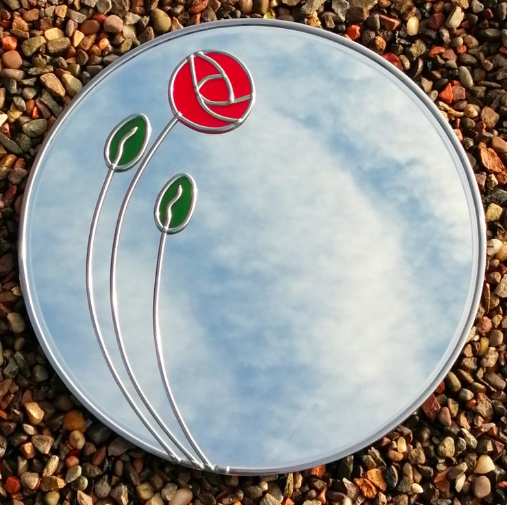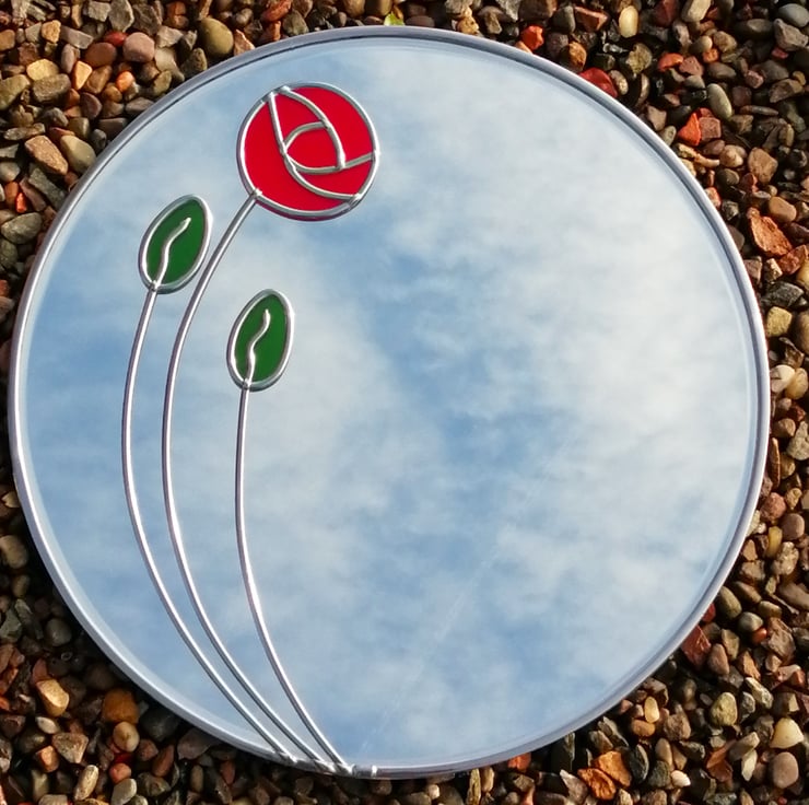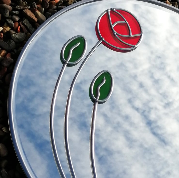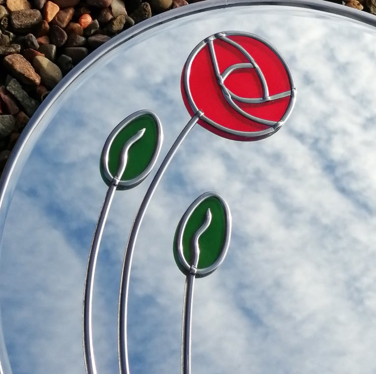 Mackintosh-inspired Art Nouveau Stained Glass Wall Mirror. Elven Glass Signature Rose in Traditional Red with Green Buds 30cm Round.