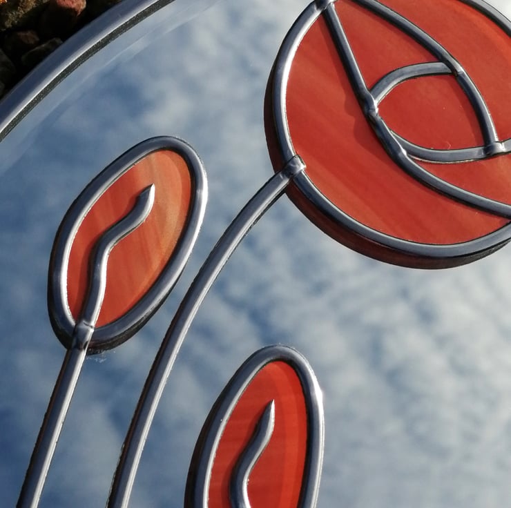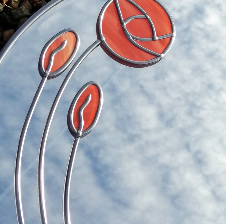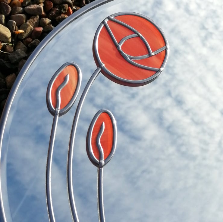 Mackintosh-style handmade Art Nouveau Rose design on a smooth-edged round glass wall mirror. Elven Glass Signature Rose. Here is a marbled burnt orange with hints of cream colour inlay, it is set against silver-lead detailing and edging to create a design that is pleasing to the eye and yet still a functional mirror for those last-minute touch-ups before you leave the house.