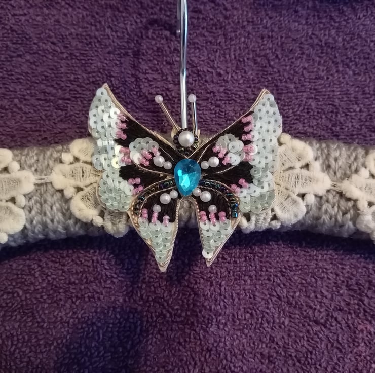 I've taken a wooden crescent clothes hanger and wrapped it in i-cord made with soft grey acrylic wool. I hand stitched cream lace over the grey base, then added a gorgeous sequence butterfly appliqué and some mini silver zardozi appliqués.